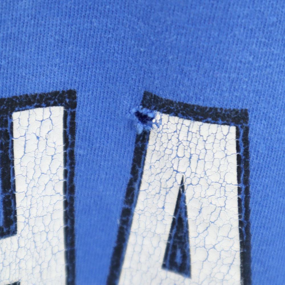 Это футболка с принтом логотипа Yamaha в виде камертона 90-х годов. Присутствует общая тусклость, пиллинг, трещины на принте, дырка спереди, пожелтение по бокам и синие пятна тут и там.. Пожалуйста, имейте это в виду перед покупкой.