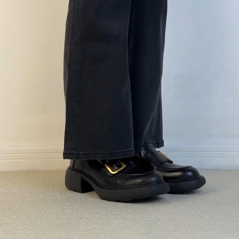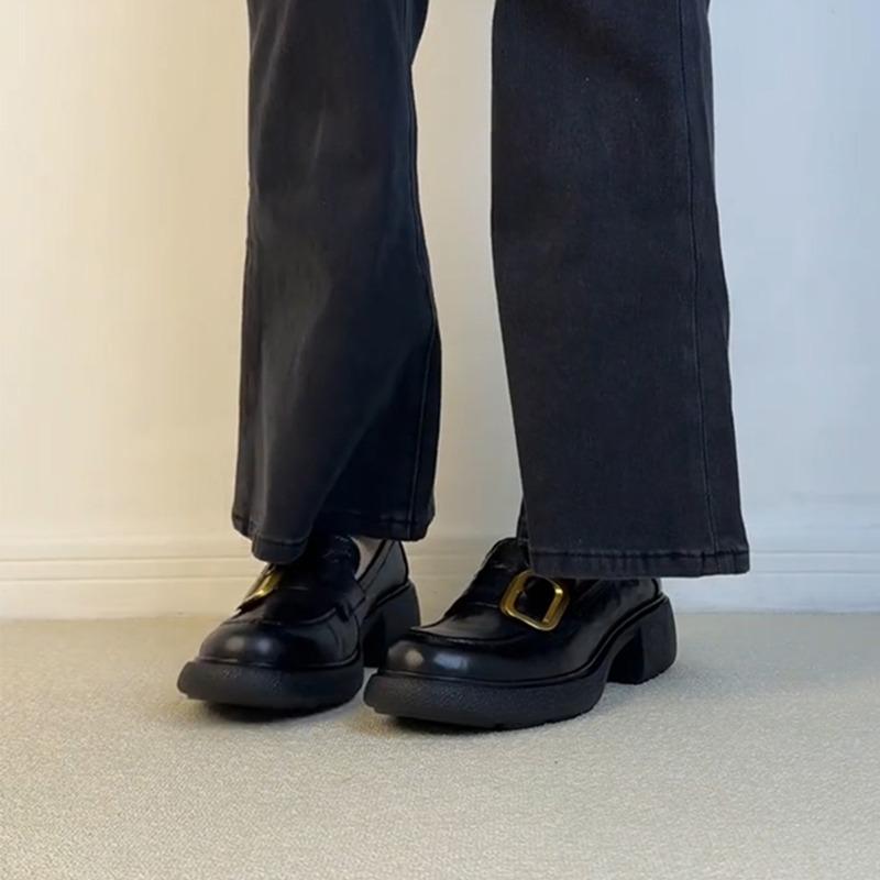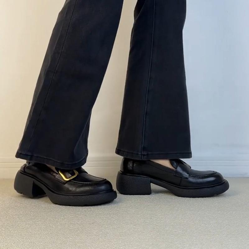 Овчина~ толстая подошва бесшумные женские ретро золотая пряжка стиль колледжа на одной педали натуральная кожа толстый каблук британские маленькие кожаные туфли