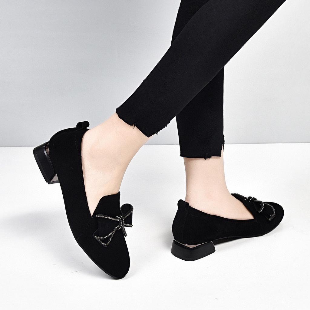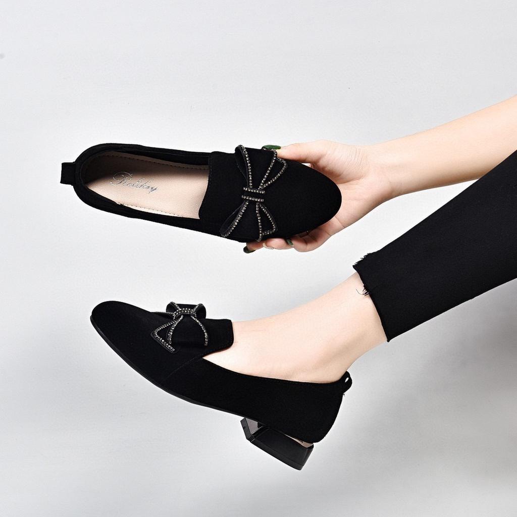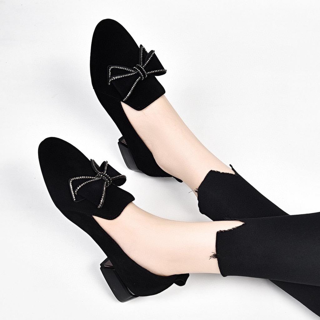 Туфли-лодочки с круглым носком, женская обувь, весна, новые, с бантом и стразами, черные, из овчины, женская обувь