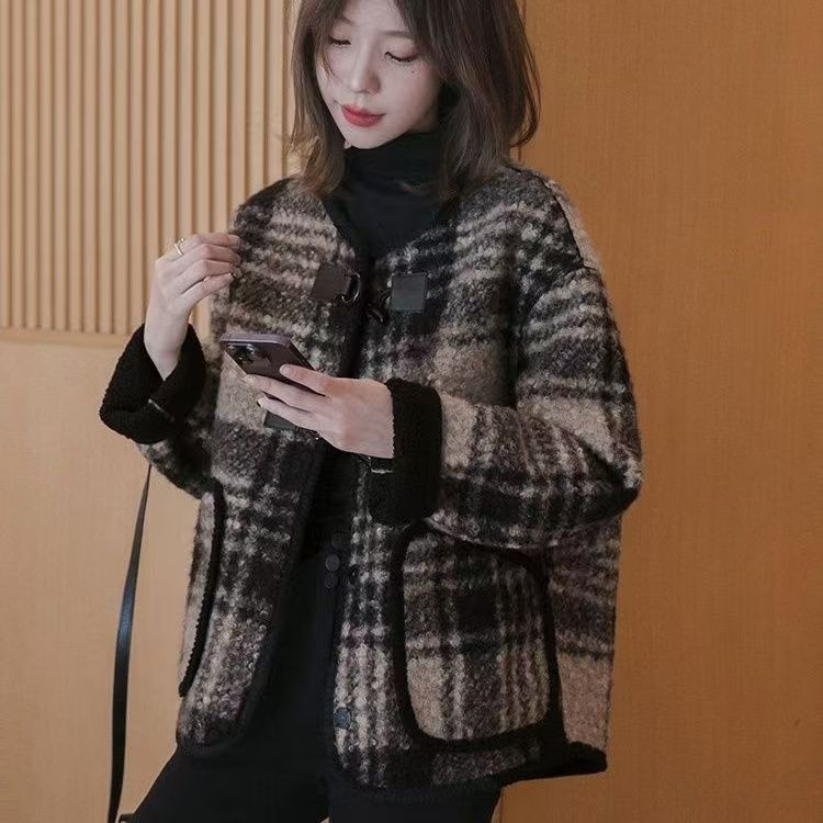 Клетчатое шерстяное весенне-осеннее пальто из овечьей шерсти свободного кроя с рукавами-рожками и ароматным ветром, на плюшевой подкладке, толстое шерстяное пальто-топ