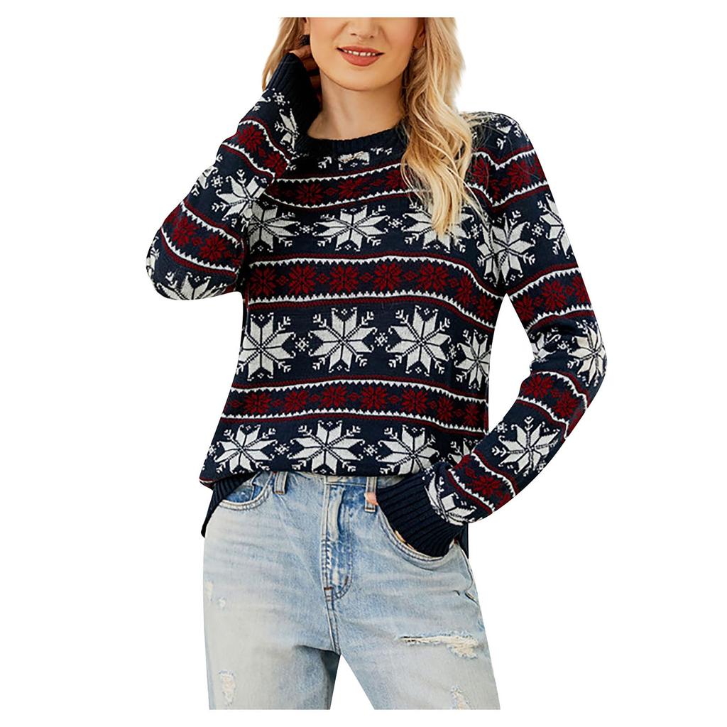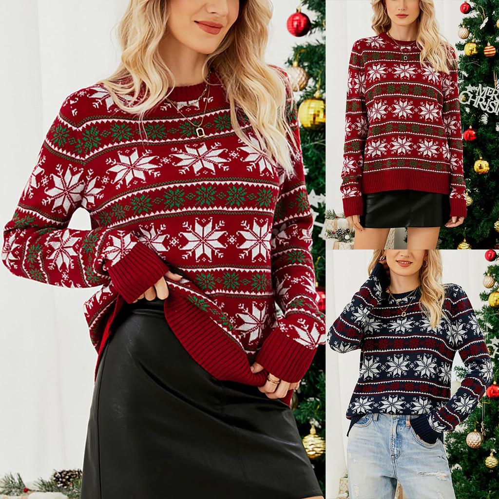 Женская мода с круглым вырезом, красный рождественский свитер со снежинками и длинными рукавами