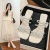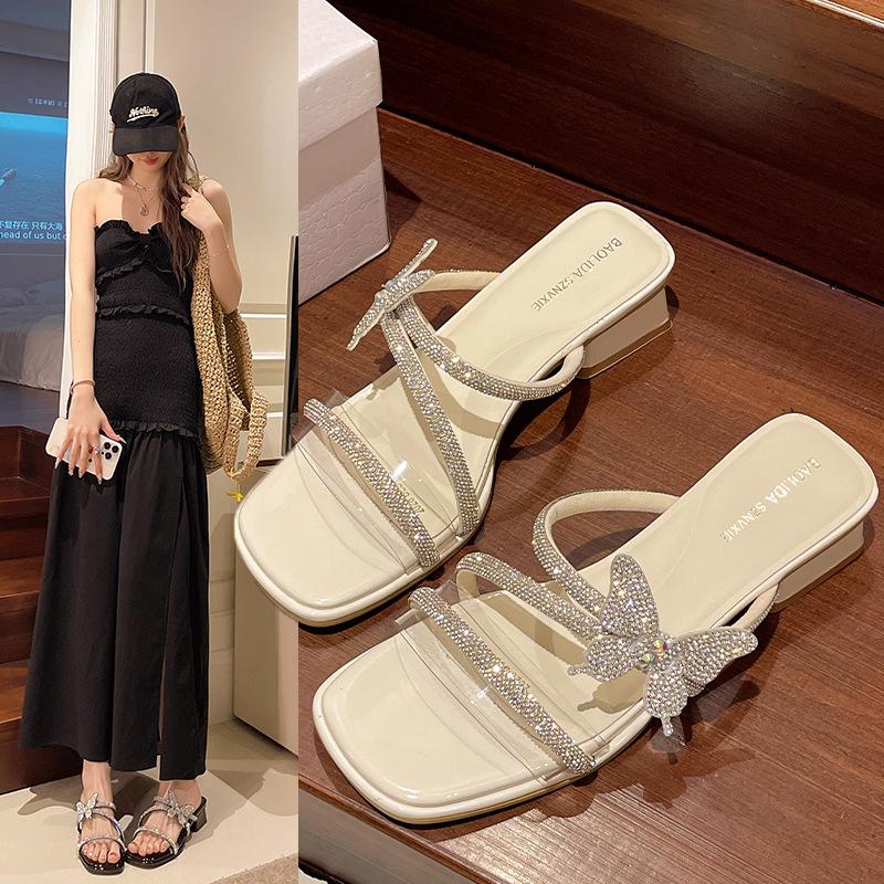 Beautiful fairy style silver butterfly thick heel slippers female 2025 new one-word strap medium heel versatile tide rhinestone sandals