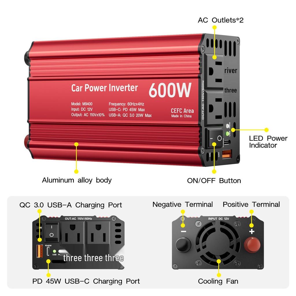 Инвертор 600 Вт с модифицированной синусоидой, быстрая зарядка PD45W, преобразователь питания 12 В в 110 В с QC3.0
