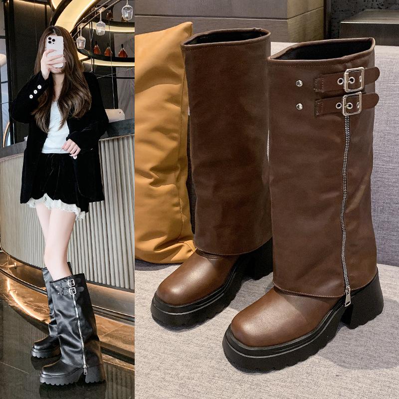Женские ботинки на толстой подошве 2025 осень и зима новые модели, но ботфорты, маленькие ботильоны, женские ботинки-рыцари на платформе