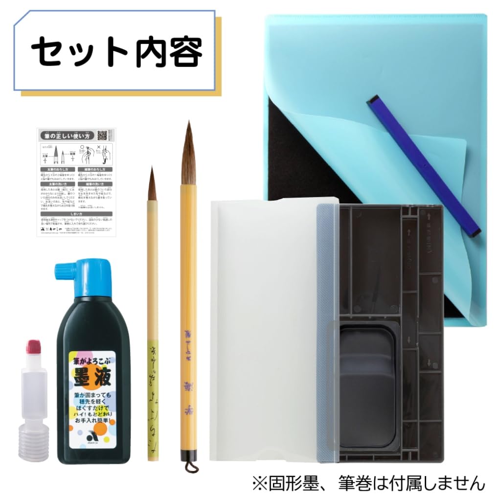 Установить содержимое: Толстая кисть, тонкая кисть, тушь (180мл), легкий двухсторонний чернильный камень (фронт: чернильница, задняя часть: чернильный пруд), резиновое пресс-папье (185 г), блокнот для письма, бумага для каллиграфии, ножницы, кувшин для воды в стиле пипетки, чехол для хранения инструментов для каллиграфии, инструкция по кистям