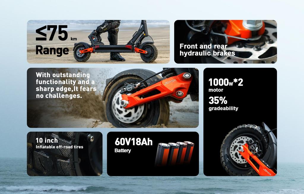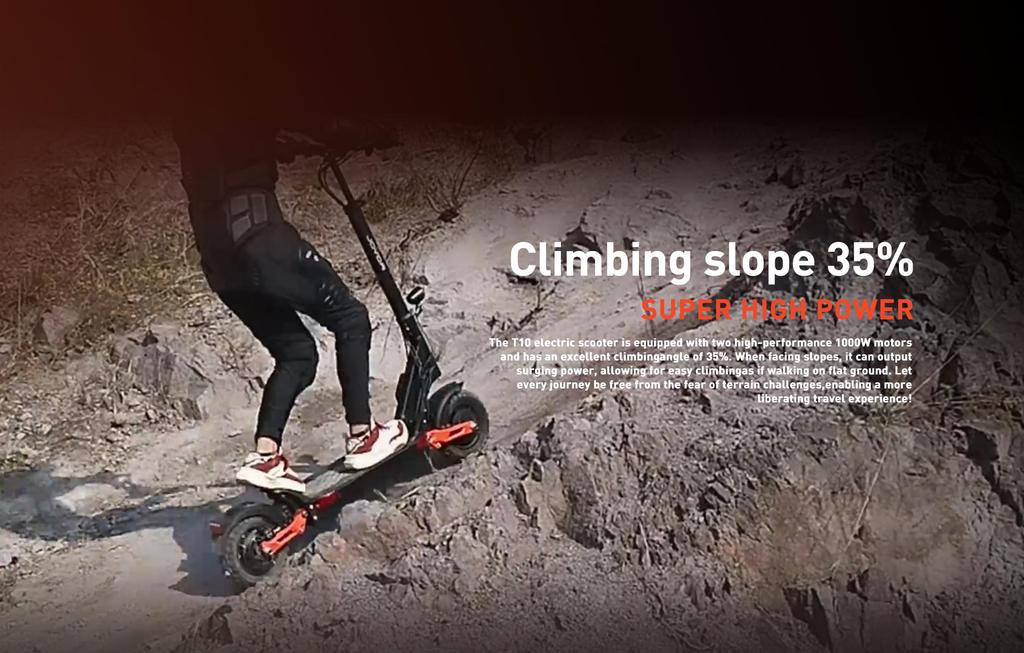 Equipped with two rated 1000W motors, the Joyor T10 delivers strong and consistent power, supporting high torque for steep climbs up to 35° and confident acceleration across various terrains.