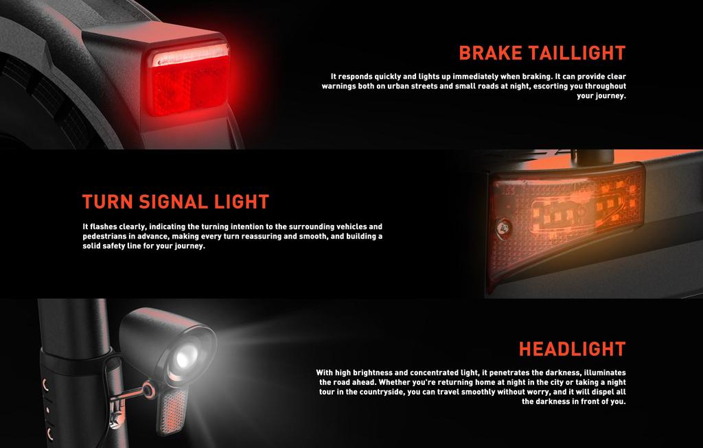 The triple lighting setup improves visibility in low-light conditions, and the front/rear hydraulic brakes provide reliable stopping power for increased safety.