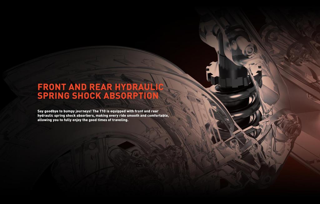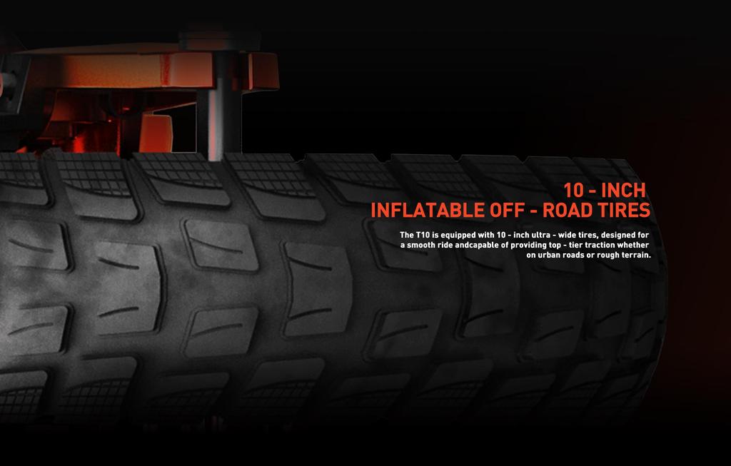 Featuring 10-inch pneumatic off-road tires and hydraulic spring suspension front and rear, the T10 ensures a smooth and stable ride on city streets as well as uneven paths.