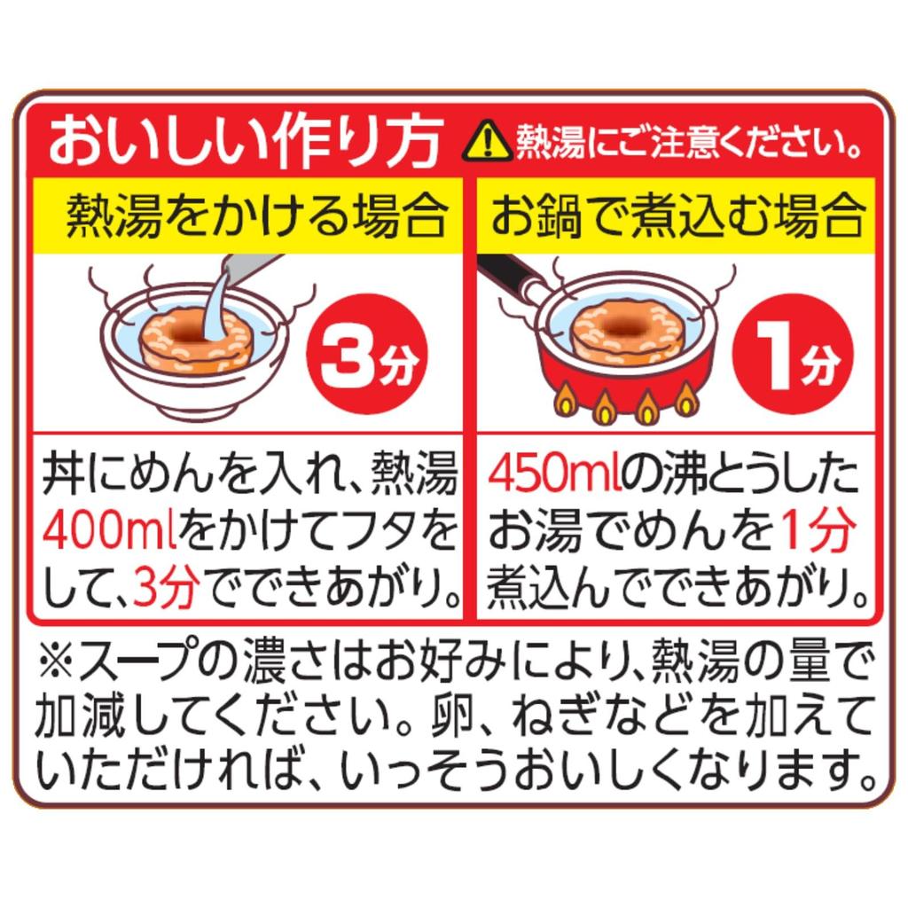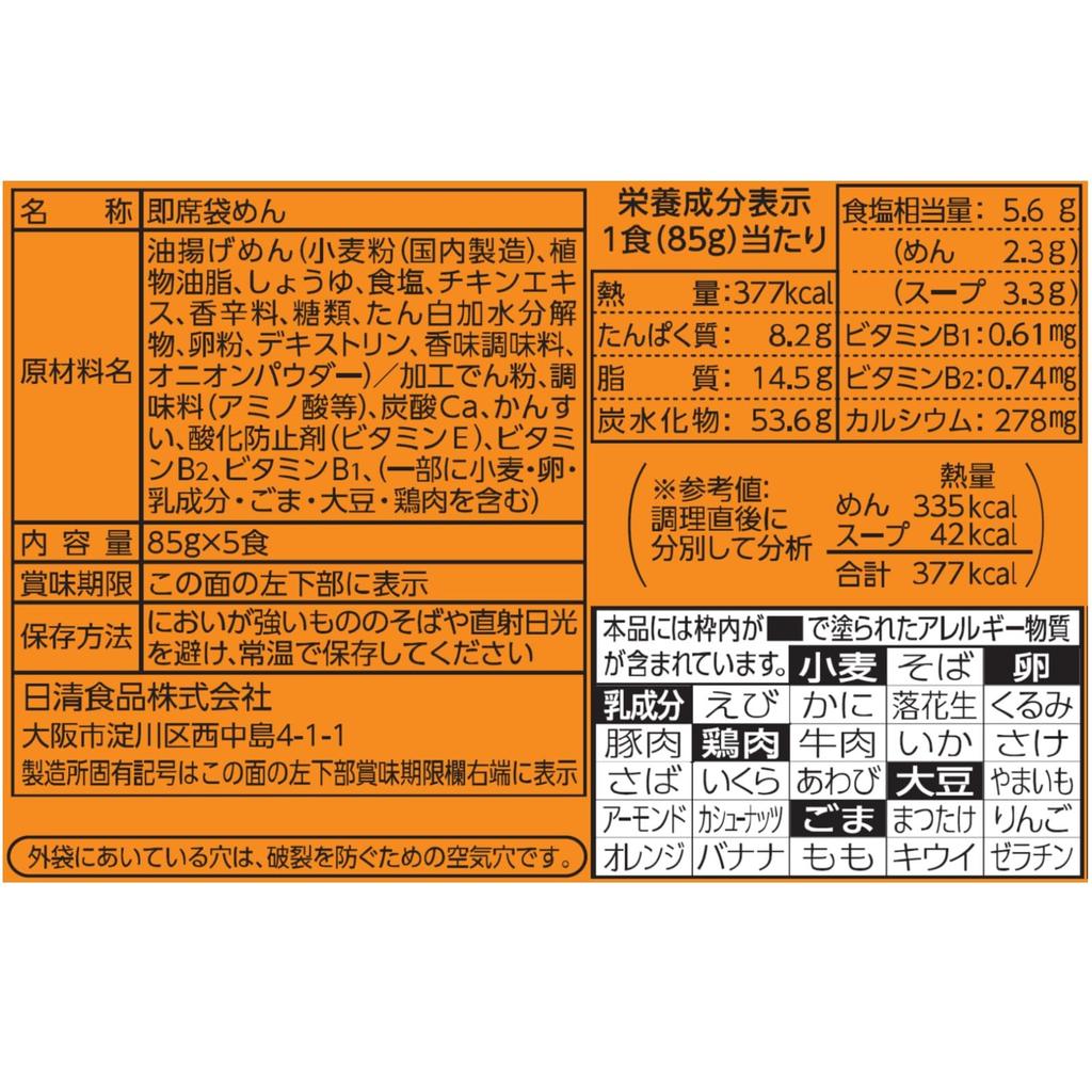 Ингредиенты: Приправленная жареная лапша (пшеничная мука, растительное масло, соевый соус, соль, крахмал, куриный экстракт, сахар, специи, яичный порошок, гидролизат белка, куриный жир, декстрин, мука из ямса, дрожжевой экстракт, лактоза), приправы (аминокислоты и др.), карбонат кальция, кансуй (щелочная вода), загущающие полисахариды, антиоксидант (витамин Е), витамин В2, витамин В1. Информация о питании: (На порцию (85g)) Энергетическая ценность 375ккал, Белки 8.3г, Жиры 13.7г, Углеводы 54.7г, Натрий 2г (лапша/топпинги 0,8 г, 1,2 г), Витамин B1 0,66 мг, Витамин B2 0,77 мг, Кальций 312 мг