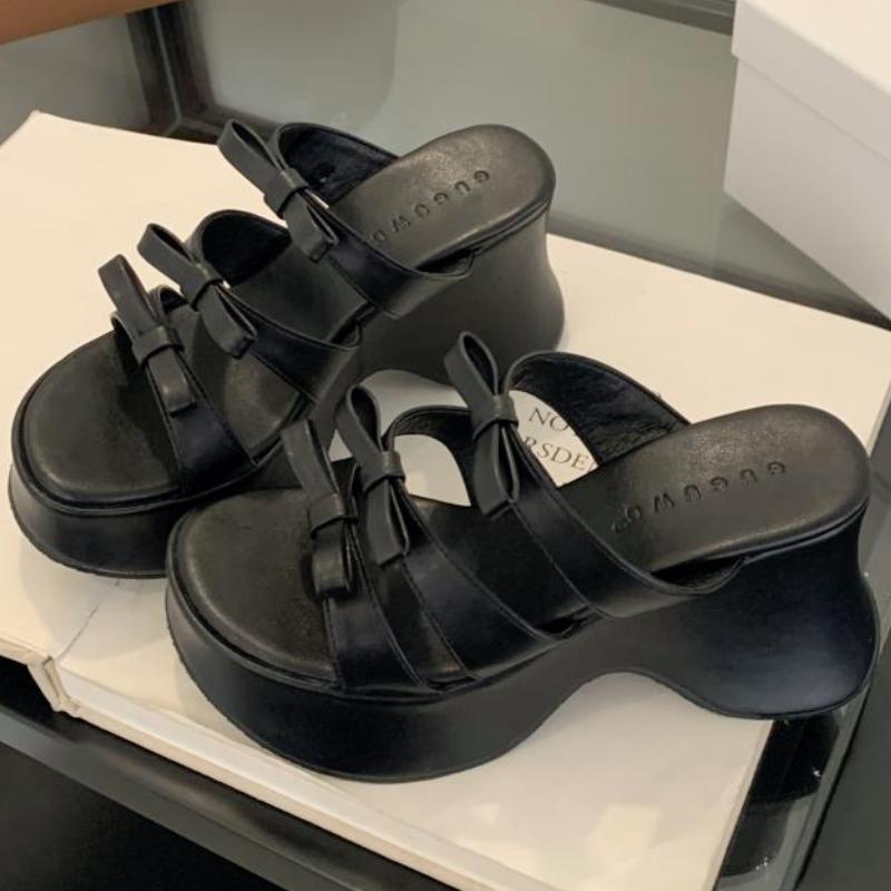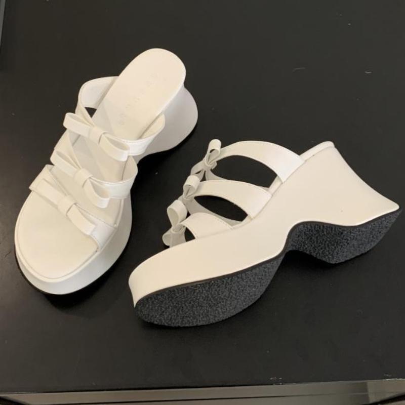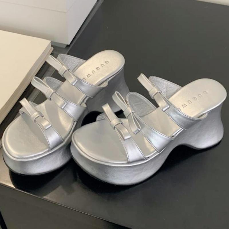 Серебристые туфли-шлепанцы на высокой платформе, модные с бантом, для вечеринки, с открытым носком, повседневные сандалии, летняя удобная нескользящая пляжная обувь-мюли для женщин