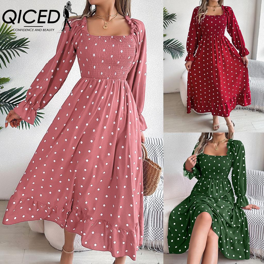 QICED Осень и Зима Повседневная Черная Юбка Миди в Горошек с Квадратным Вырезом и Отделкой Ушками для Женщин