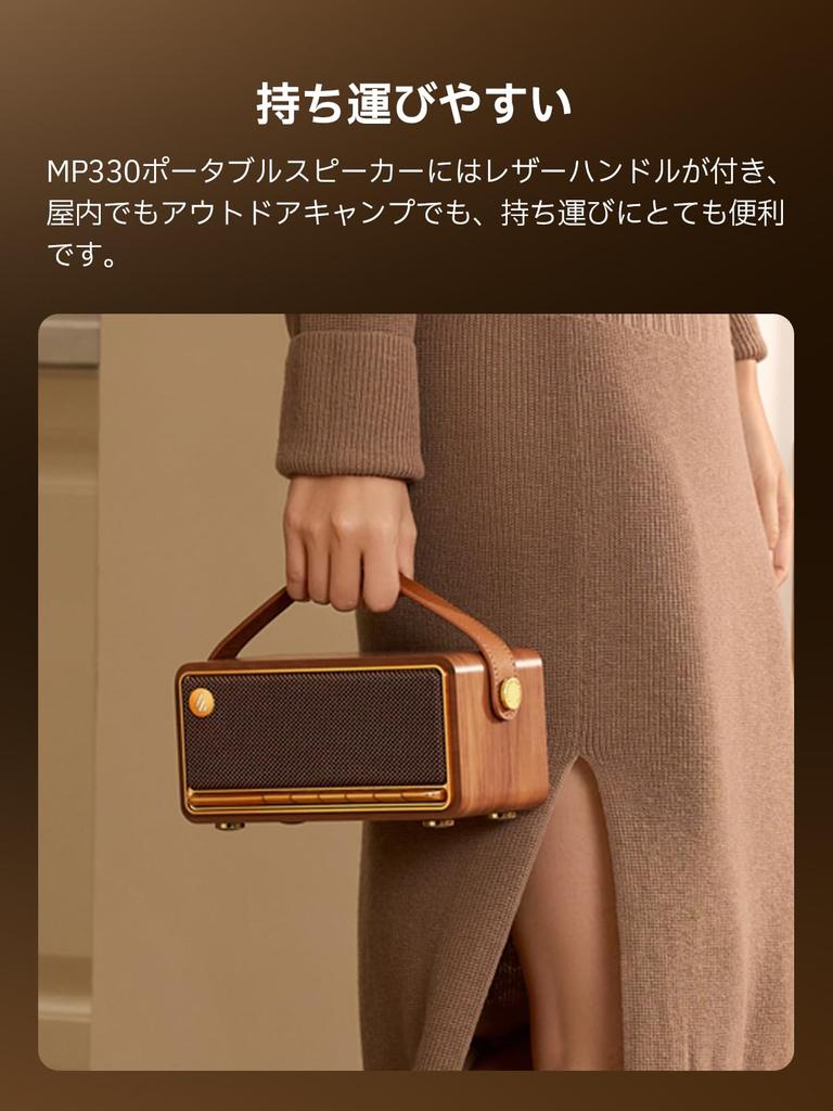 Легко носить: Портативная колонка MP330 оснащена кожаной ручкой, что позволяет легко носить ее как в помещении, так и на улице, будь то в походе или на природе.