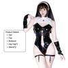 Erotic Sexy Anime Nun Uniform Cosplay Women PU Leather Transparent Hollow Bodysuit Gothic Sister Maid Costume Halloween Jumpsuit