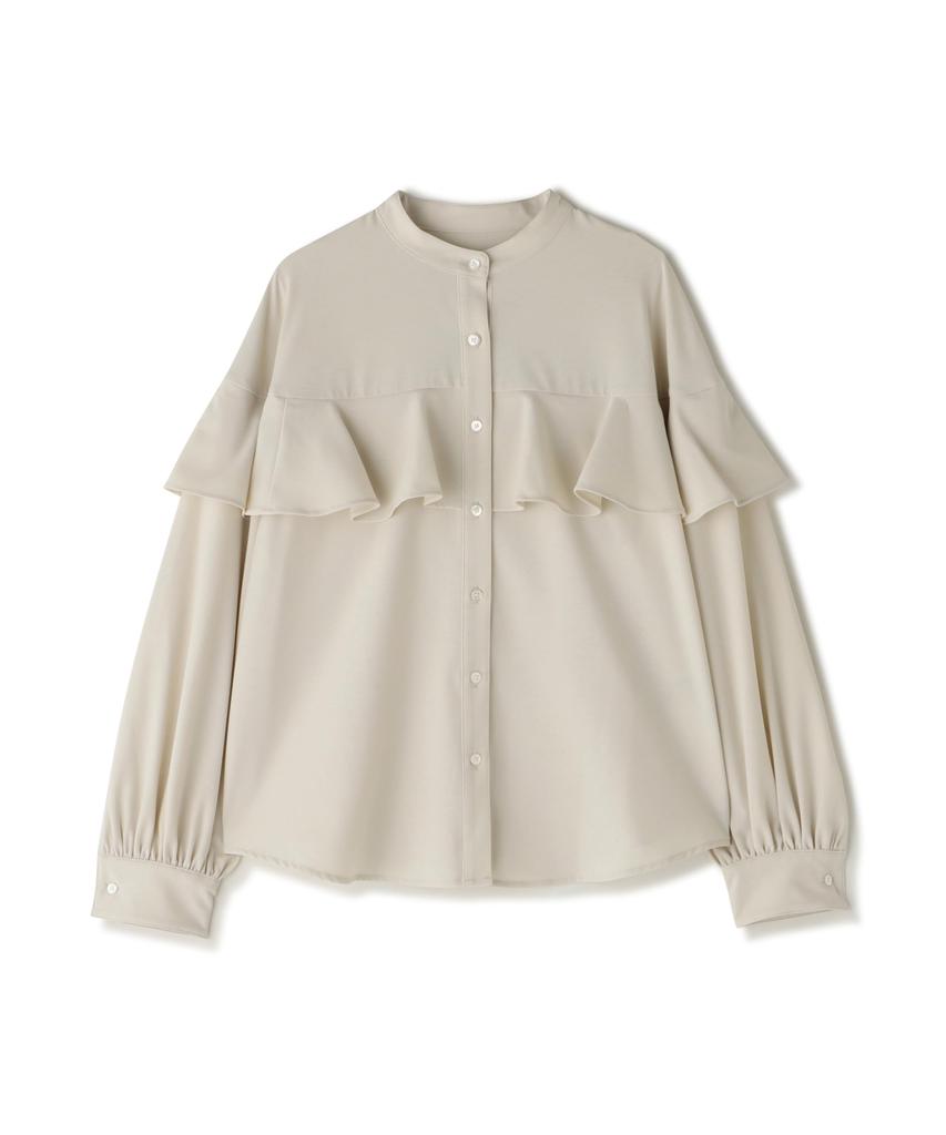 N Natural Beauty Band Collar Ruffle Long Sleeve White Basic Women's Blouse,