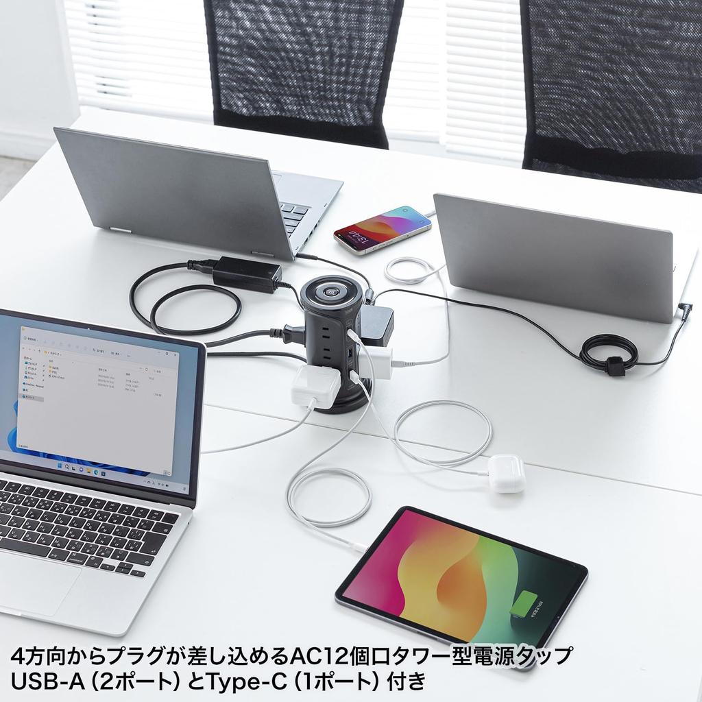 Sanwa Supply Power Strip with 12 AC 2 and 1 2m and a Centralized Tower-Style Outlets, USB-A Ports, Type-C Port, Length, Switch, Black, TAP-B112C1A2BK