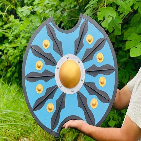 Этот щит вдохновлен культовым гоплоном, который носили воины Древней Греции и Спарты.. Он имеет классическую круглую форму с выраженным центральным выступом, предназначенным для отражения ударов и снарядов..