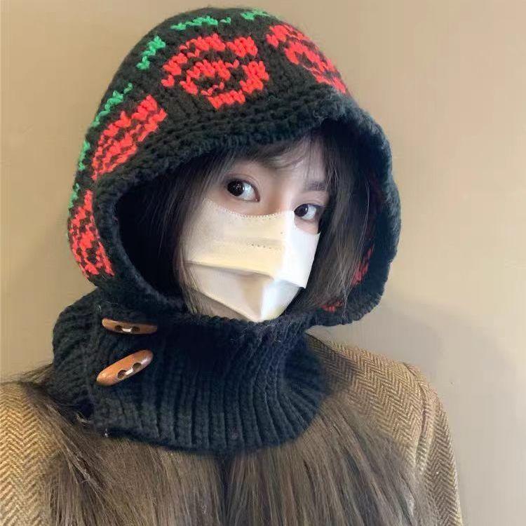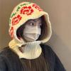 Вязаная балаклава с цветами в корейском стиле для женщин, зимняя теплая шерстяная шапка, грелка для шеи, защита ушей, интегрированная шапка-бини