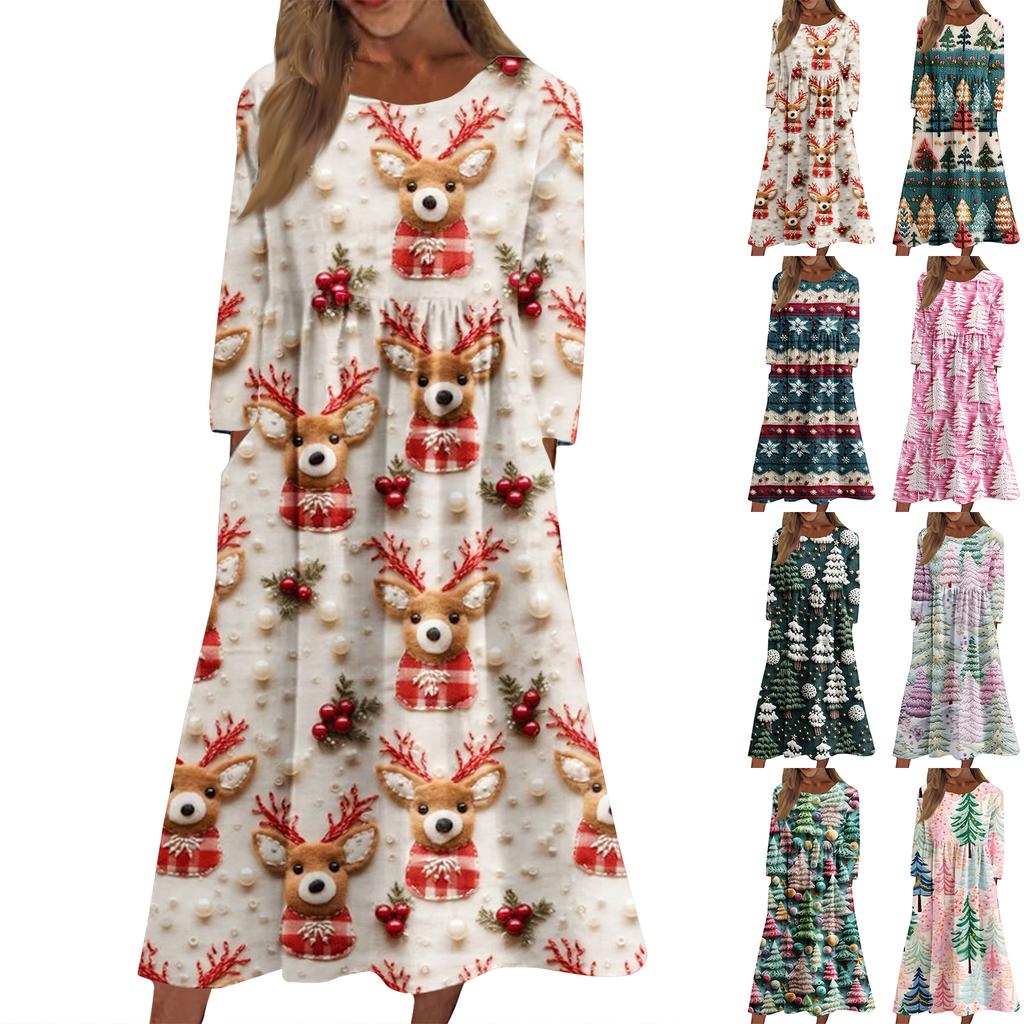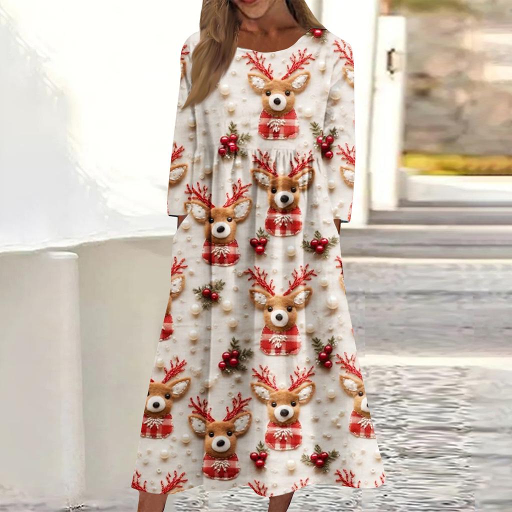 Женское повседневное миди-платье с круглым вырезом и рождественским принтом, с длинным рукавом и карманом