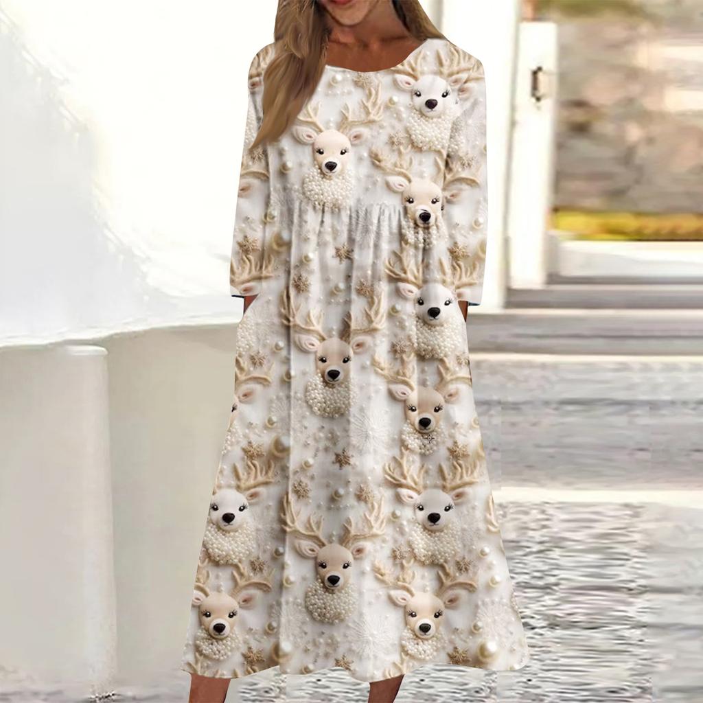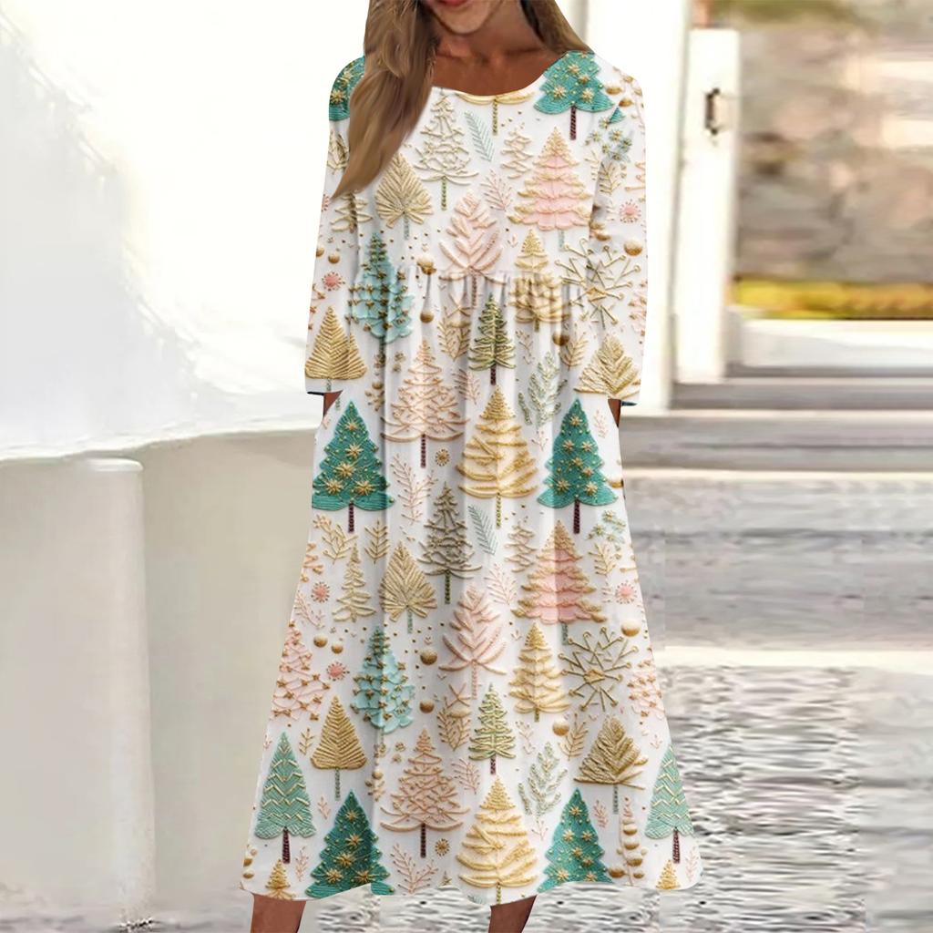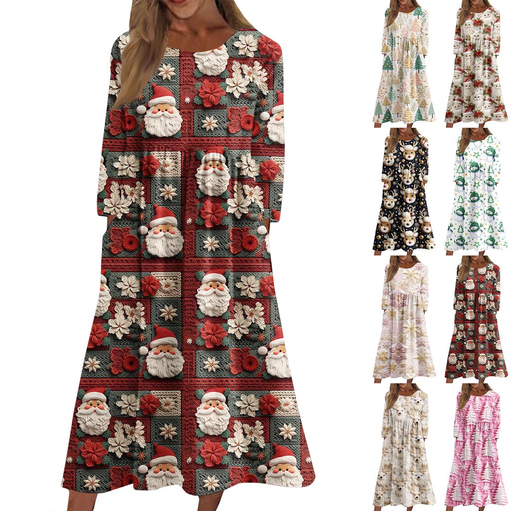 Женское повседневное миди-платье с круглым вырезом и рождественским принтом, с длинным рукавом и карманом
