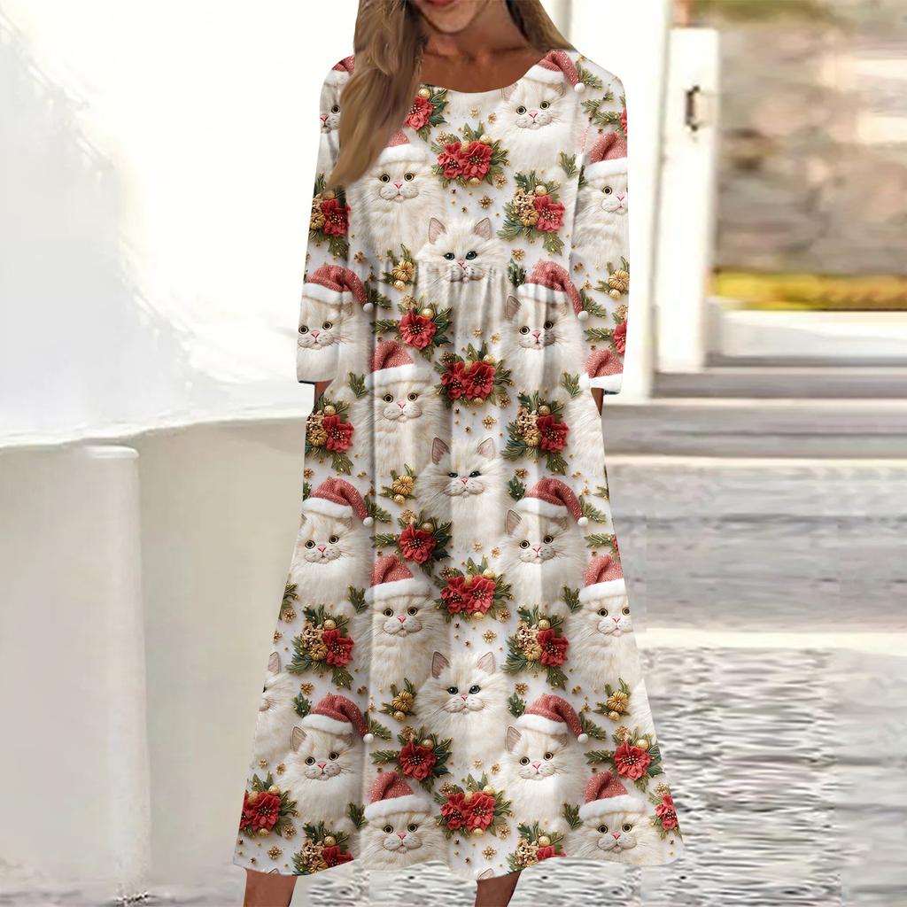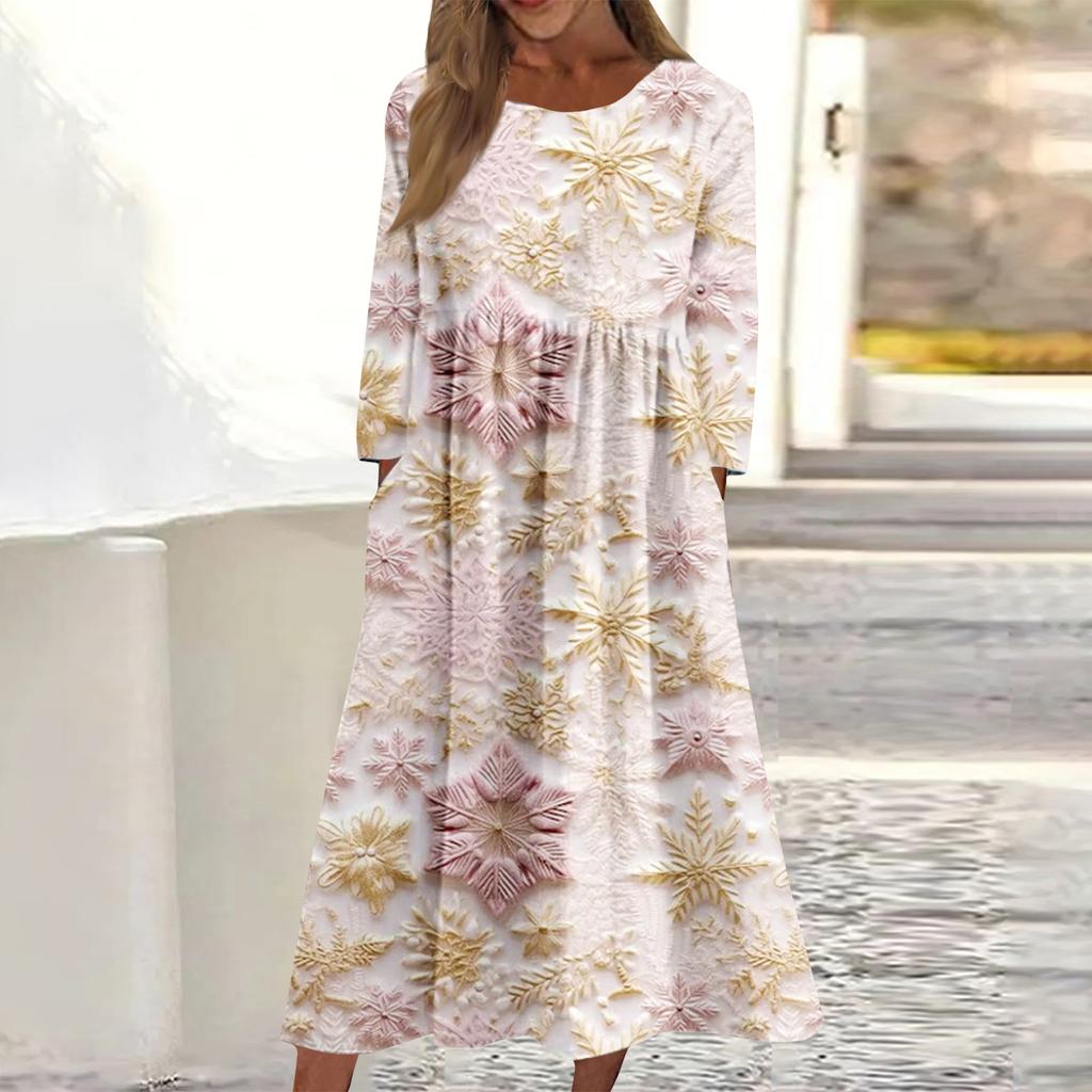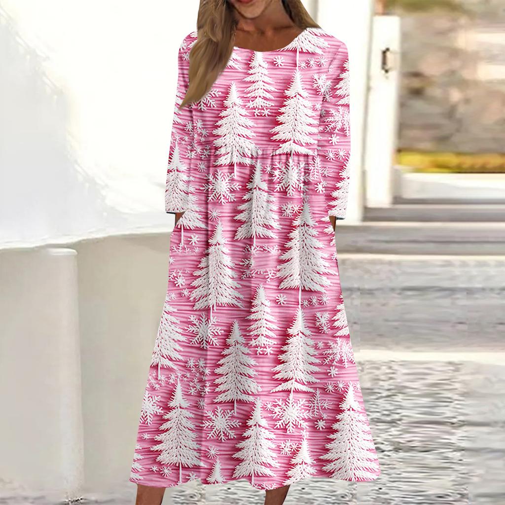 Женское повседневное миди-платье с круглым вырезом и рождественским принтом, с длинным рукавом и карманом