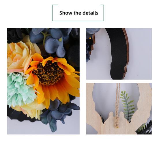 Гармоничная цветовая палитра: Насладитесь гармоничным сочетанием желтых, синих и зеленых оттенков в цветах и зелени этого венка.. Сбалансированная цветовая схема обогащает визуальную эстетику, не перегружая ее, и легко дополняет различные стили декора.