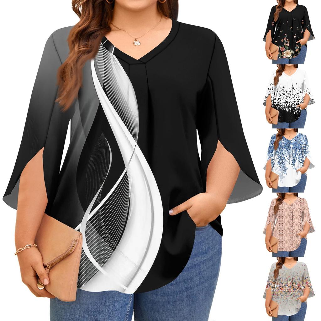 Женские топы с принтом, V-образным вырезом, больших размеров, с рукавами 3/4, элегантные рубашки — купить товар онлайн с бесплатной доставкой до всему миру!