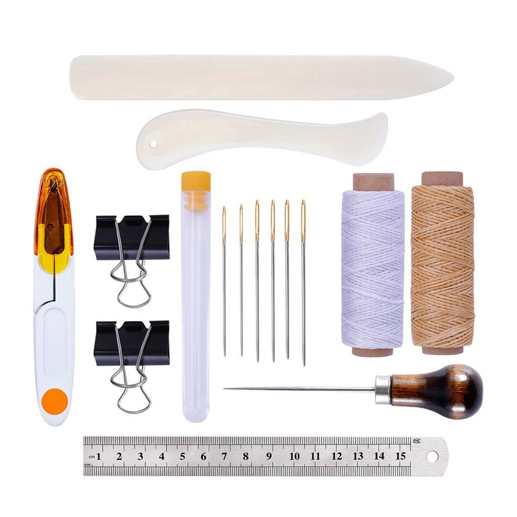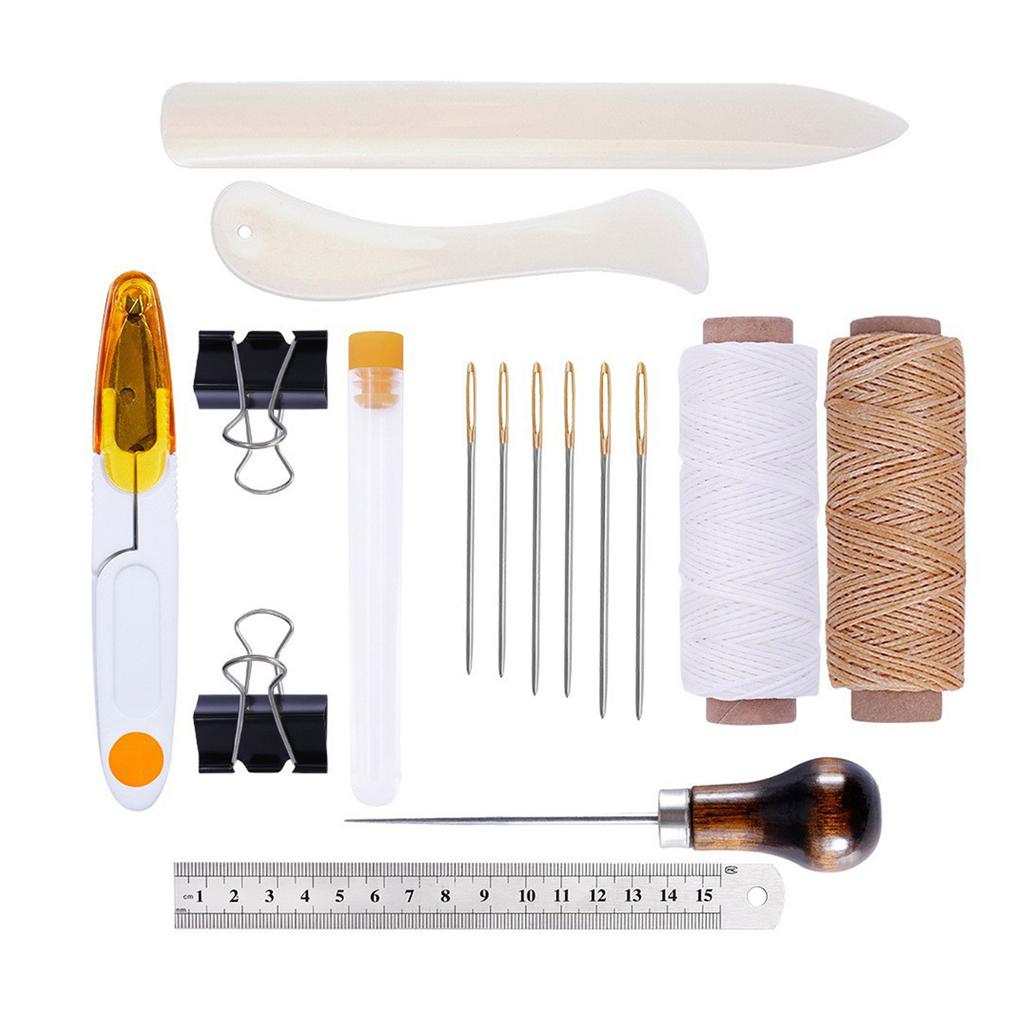 Этот базовый набор инструментов для шитья и тиснения по коже включает в себя различные шила, разметочный ролик для шва, канавкорез для шва, шила, вощеную нить, швейную иглу, инструмент для шлифовки краев кожи, наперсток, матовые полоски, напальчники и т.д.. Разные наборы содержат разные инструменты для работы с кожей.