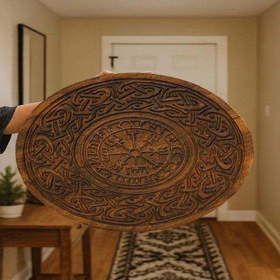 Устали от скучного, массового декора? Мечтаете ли вы об эпических битвах, древних сагах и легендарных героях? Окунитесь в мир бесстрашных скандинавских воинов с этим потрясающим деревянным щитом викинга ручной резьбы.. Это не просто предмет декора; это заявление. Это свидетельство силы, приключений и вневременного мастерства.