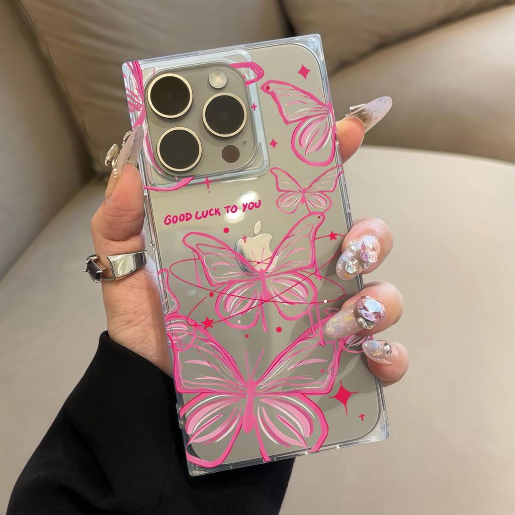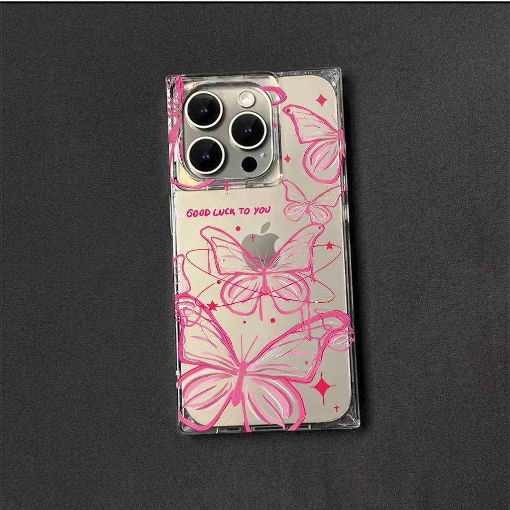 Прозрачный чехол с квадратной задней стенкой и защитой боковых граней для iPhone 13 15 Plus 11 12 14 Pro Max 16 ProMax, Защита от окисления, Чехол с узором из множества розовых бабочек