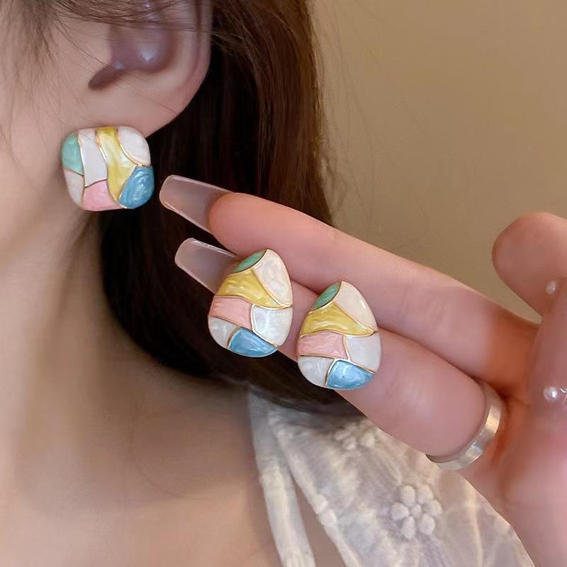 Красочные серьги-гвоздики в виде капли воды с глазурью для женщин, синяя розовая эмаль, разноцветные клетки, маленькие квадратные серьги для девочек, бохо-украшения