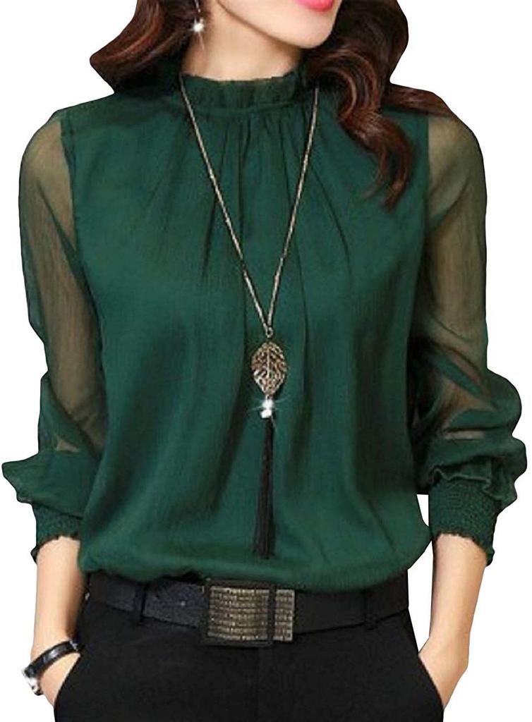 Прозрачная блузка с длинным рукавом, шифоновыми оборками, однотонная, размеры ORANGECODE для женщин, цвет, формальная, M-3XL (Зеленый, XL) — купить товар онлайн с бесплатной доставкой по всему миру!