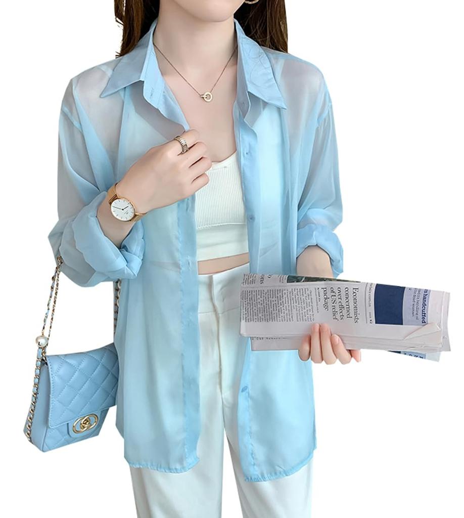 [JIYUTOR]♡ У него крутой, прозрачный вид. Женственная и здоровая рубашка. Его можно использовать для защиты от солнца или в качестве верхнего слоя в холодных помещениях с кондиционером.. Прозрачный материал имеет именно ту степень прозрачности, которая нужна, поэтому даже в сочетании с майкой или камисолью он не выглядит слишком откровенно и создает элегантный образ.