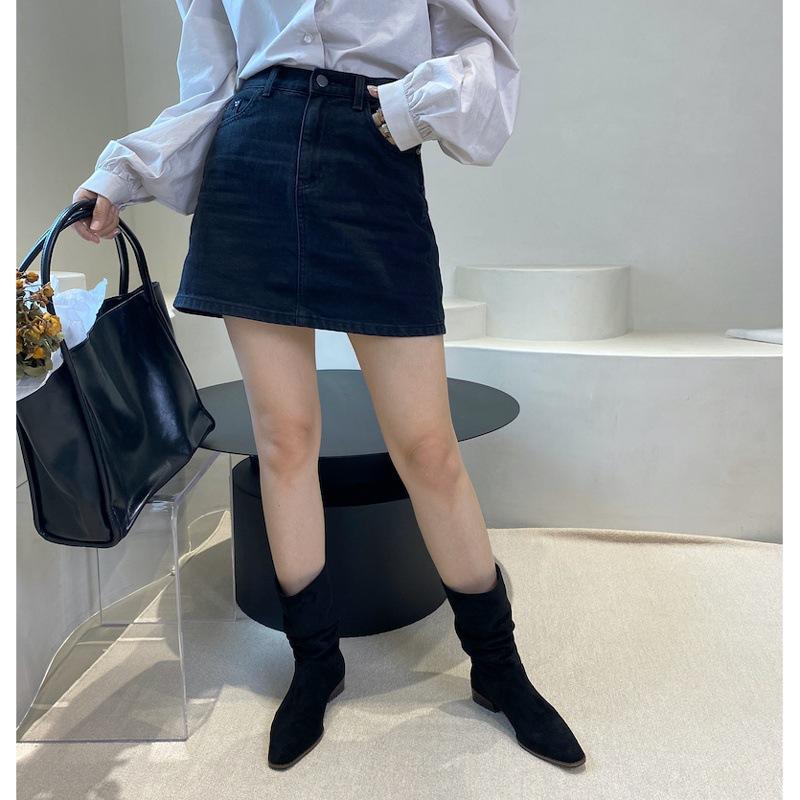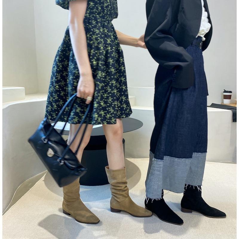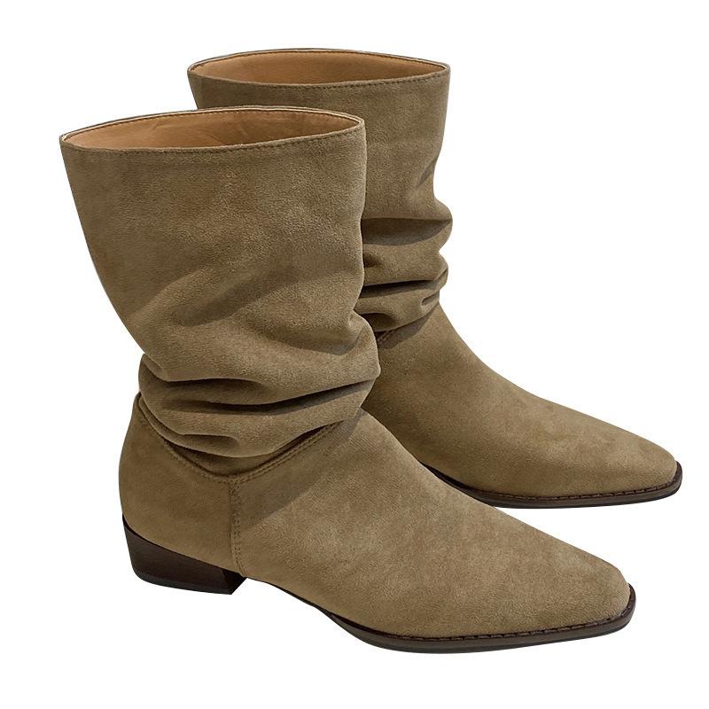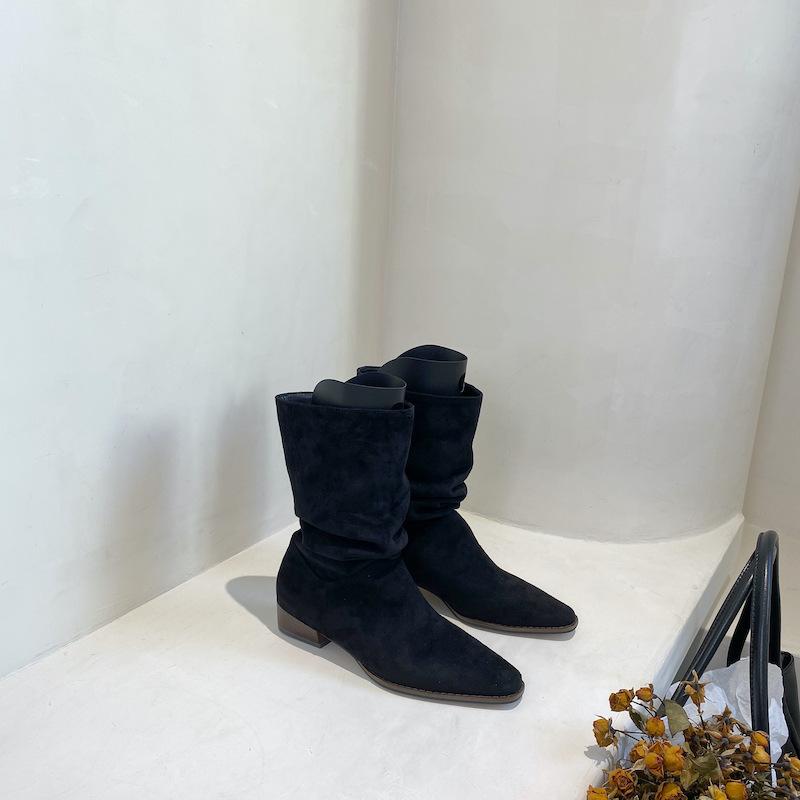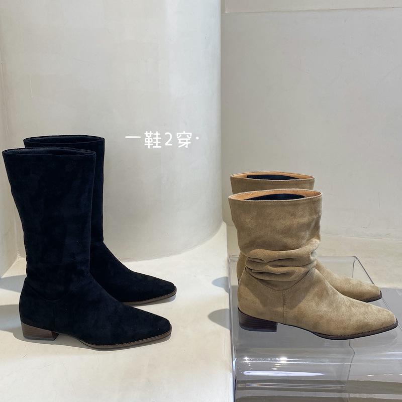 Полусапоги ковбойские западные на наборном каблуке женские летние тонкие весенне-осенние одинарные сапоги замшевые с острым носком короткие сапоги-чулки до середины голени сапоги рыцарские короткие