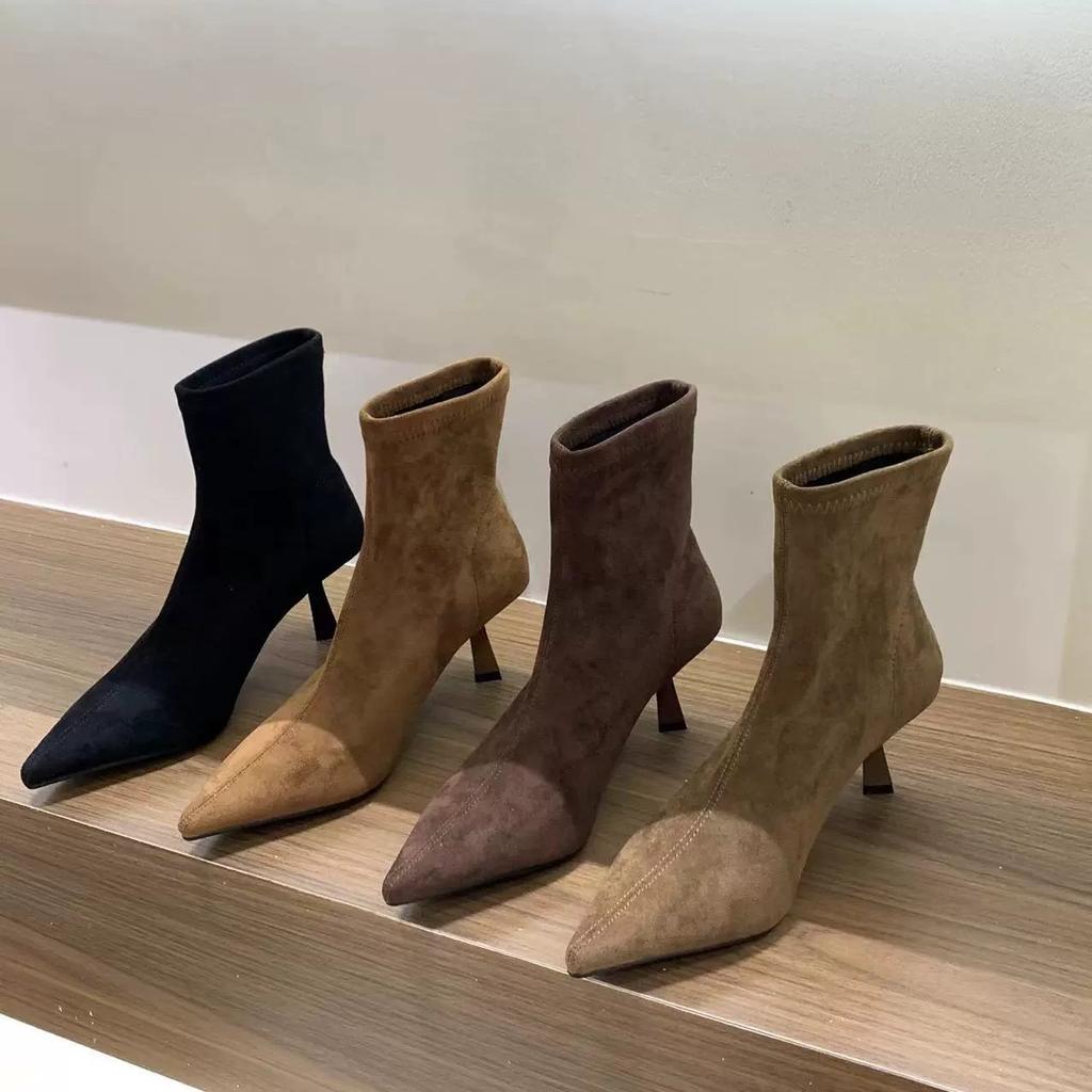 Женские туфли, короткие ботильоны хаки из замши на высоком каблуке с острым носком, новая весенне-осенняя одиночная обувь, корейские маленькие ботильоны
