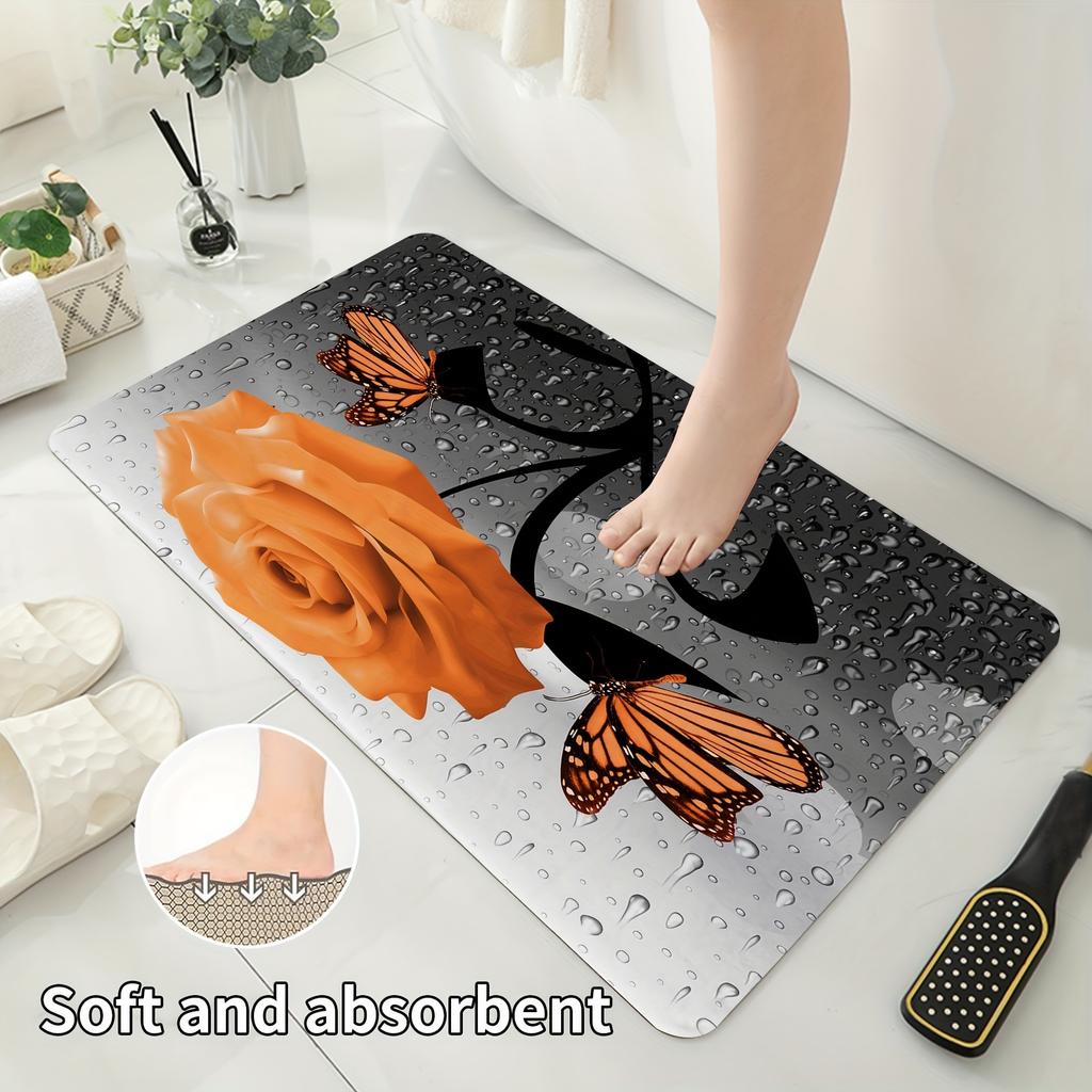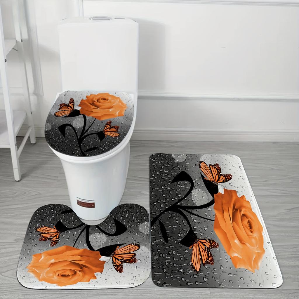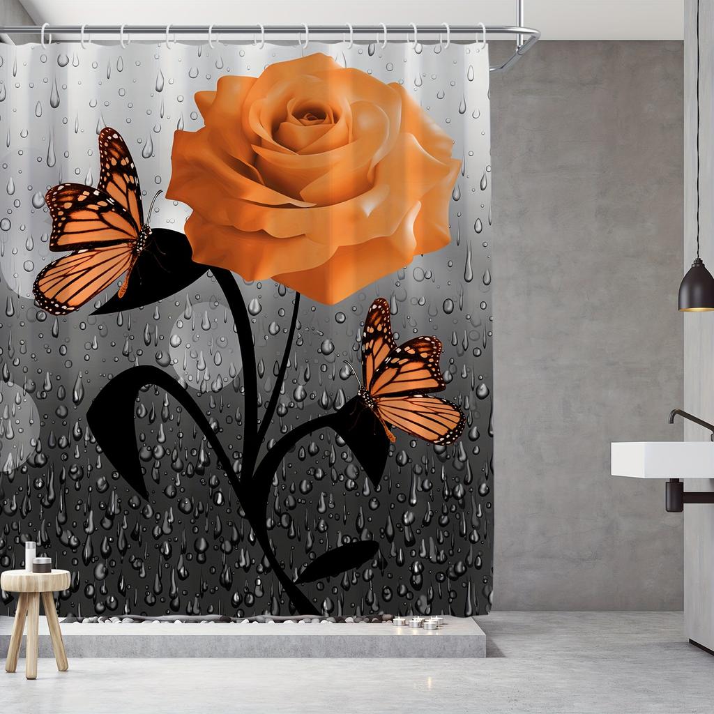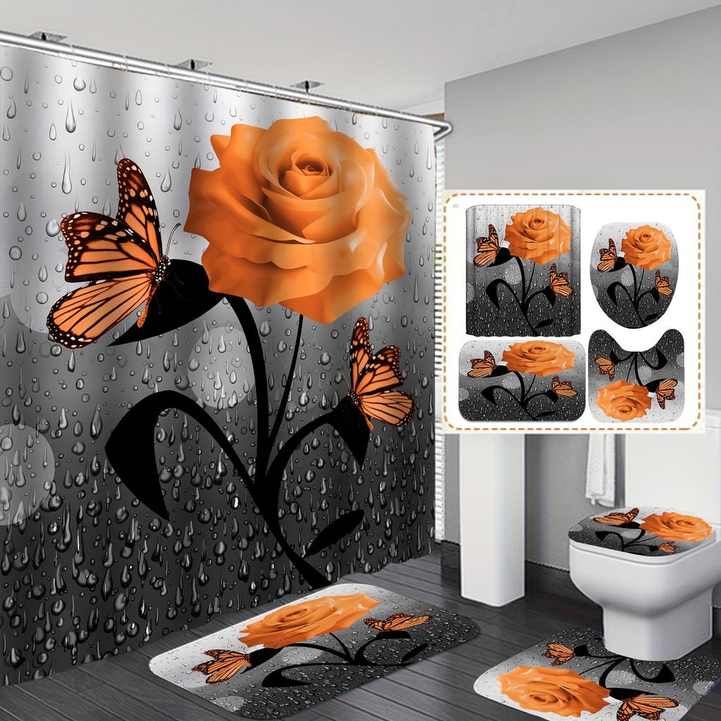Набор из 4 предметов Оранжевый Дождь из роз Бабочка Шторка для душа Набор из 4 предметов, Водонепроницаемая тканевая шторка для душа, Коврик для крышки унитаза, Коврик для душа, 12 крючков, 71*71 дюйм
