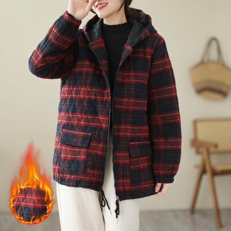 Женские большие размеры Осень и Зима Клетчатый принт Утолщенный Утепленный Клетчатый Капюшон Свободный Разрез на молнии Принтованная Длинная Куртка Повседневные Уличные Топы