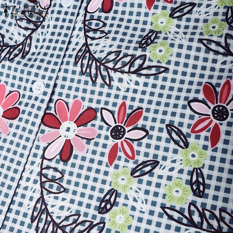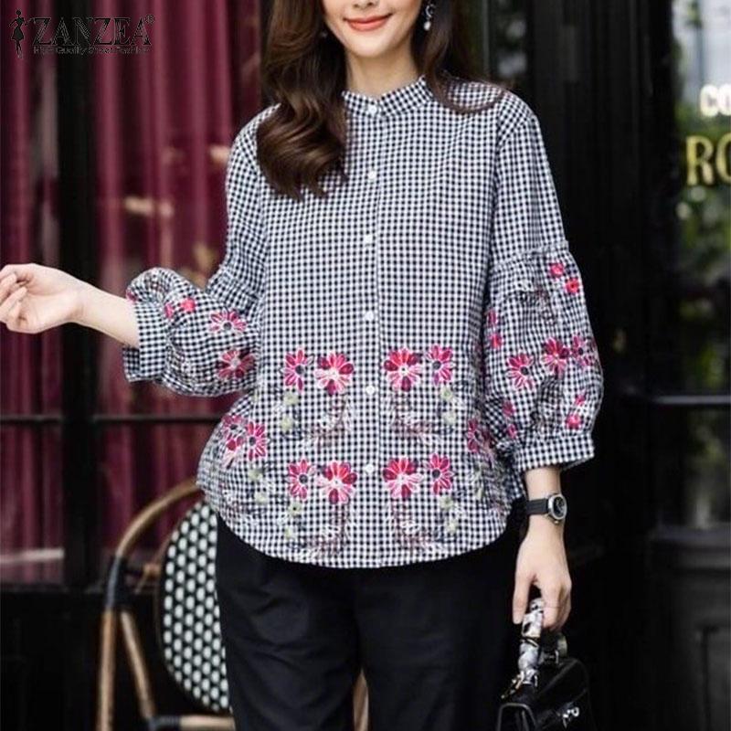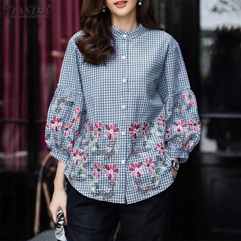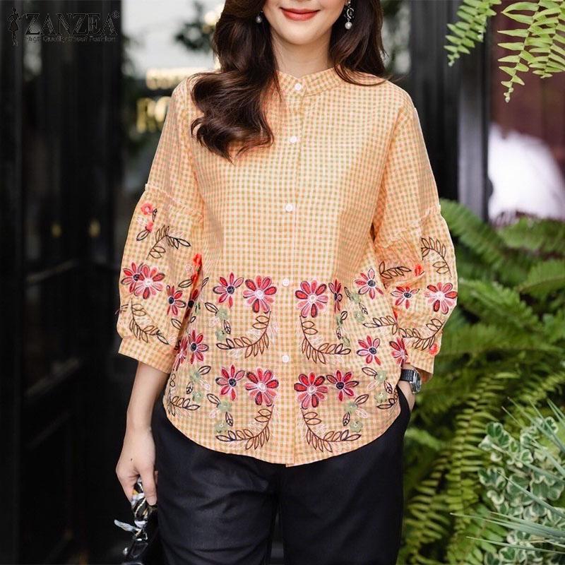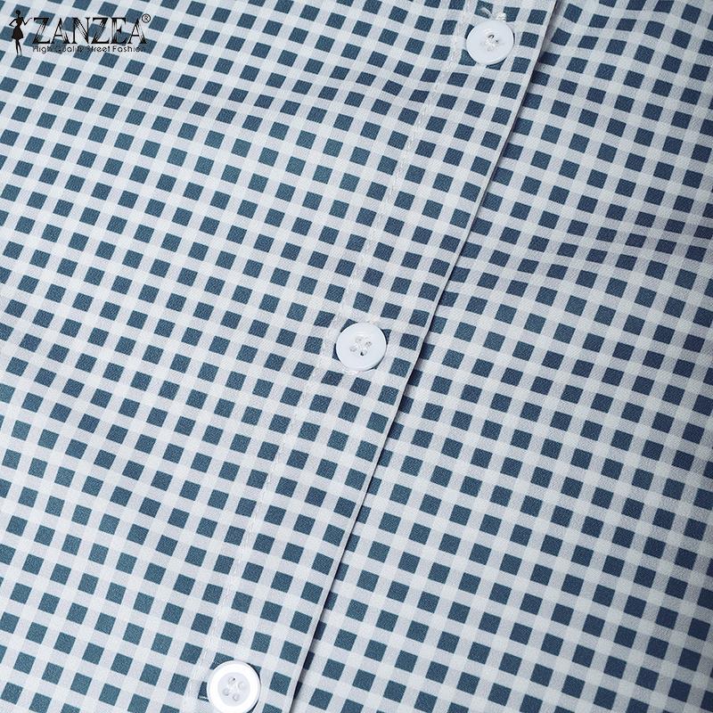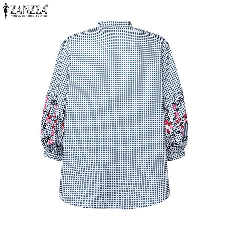 ZANZEA Женская повседневная блузка свободного кроя с воротником-стойкой, рукавом 3/4 и клетчатым принтом