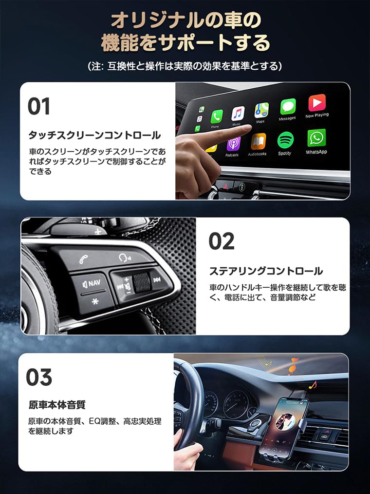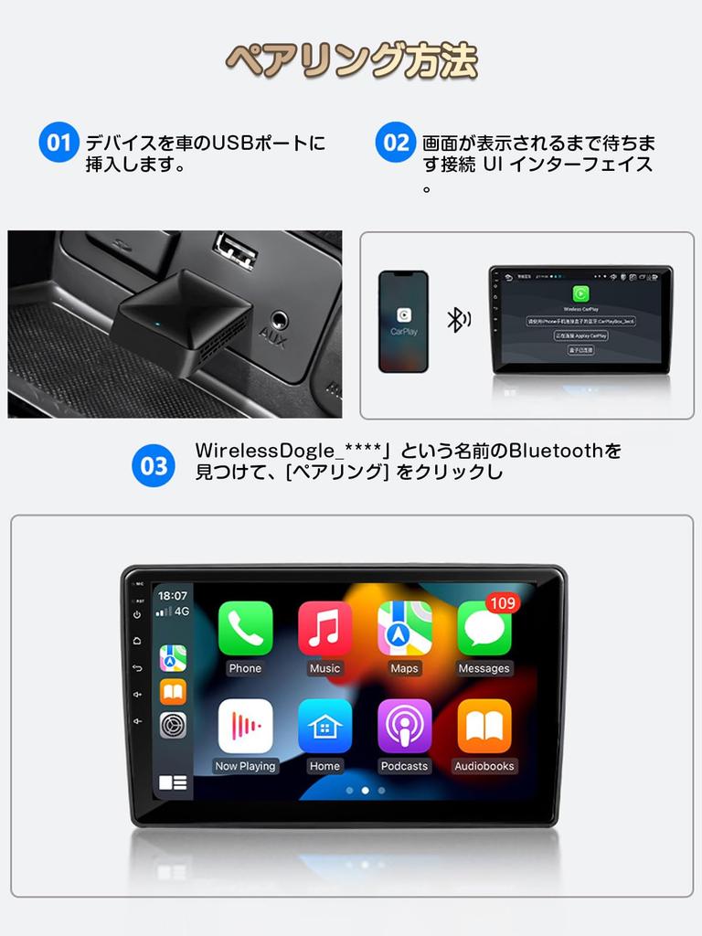 【Умный и безопасный помощник для вождения】Этот беспроводной адаптер Carplay позволяет синхронизировать приложение iPhone с дисплеем вашего автомобиля и полностью совместим с оригинальными методами управления автомобиля, такими как сенсорный экран, кнопки и ручки. Беспроводное использование всех оригинальных функций CarPlay, включая голосовое управление, Siri, онлайн-музыку, навигационные приложения GPS, музыкальные приложения, звонки и сообщения