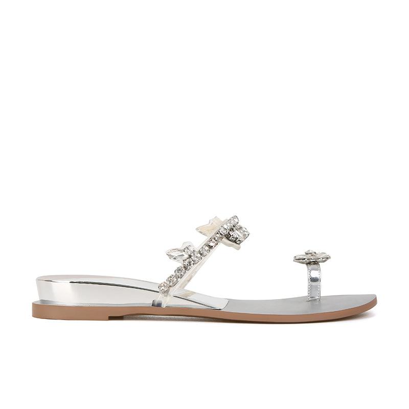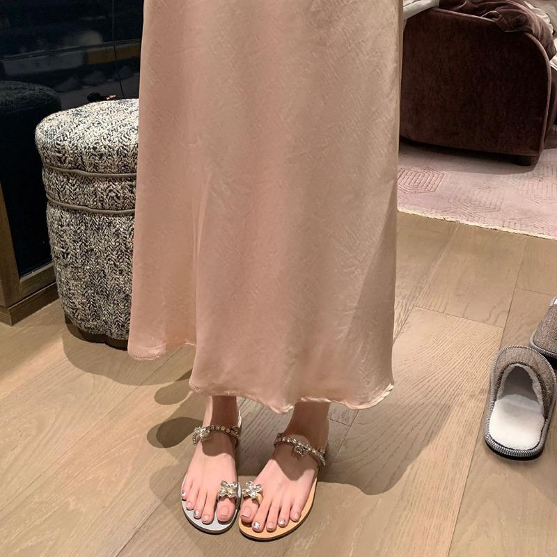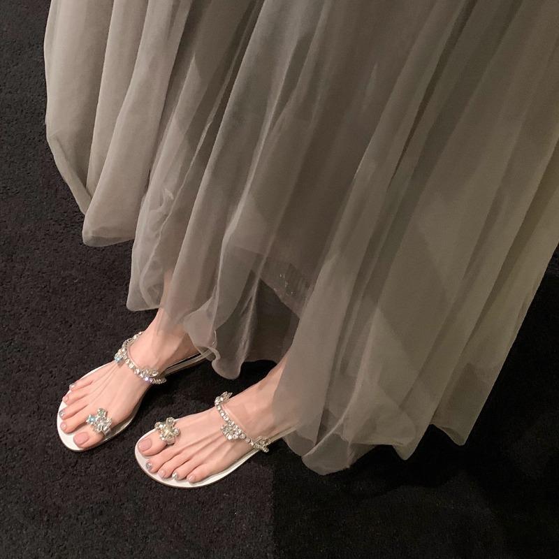 [] Sleepwalking in summer~ Flower diamond buckle slope heel set toe flat-bottomed slippers women's sandals wear summer