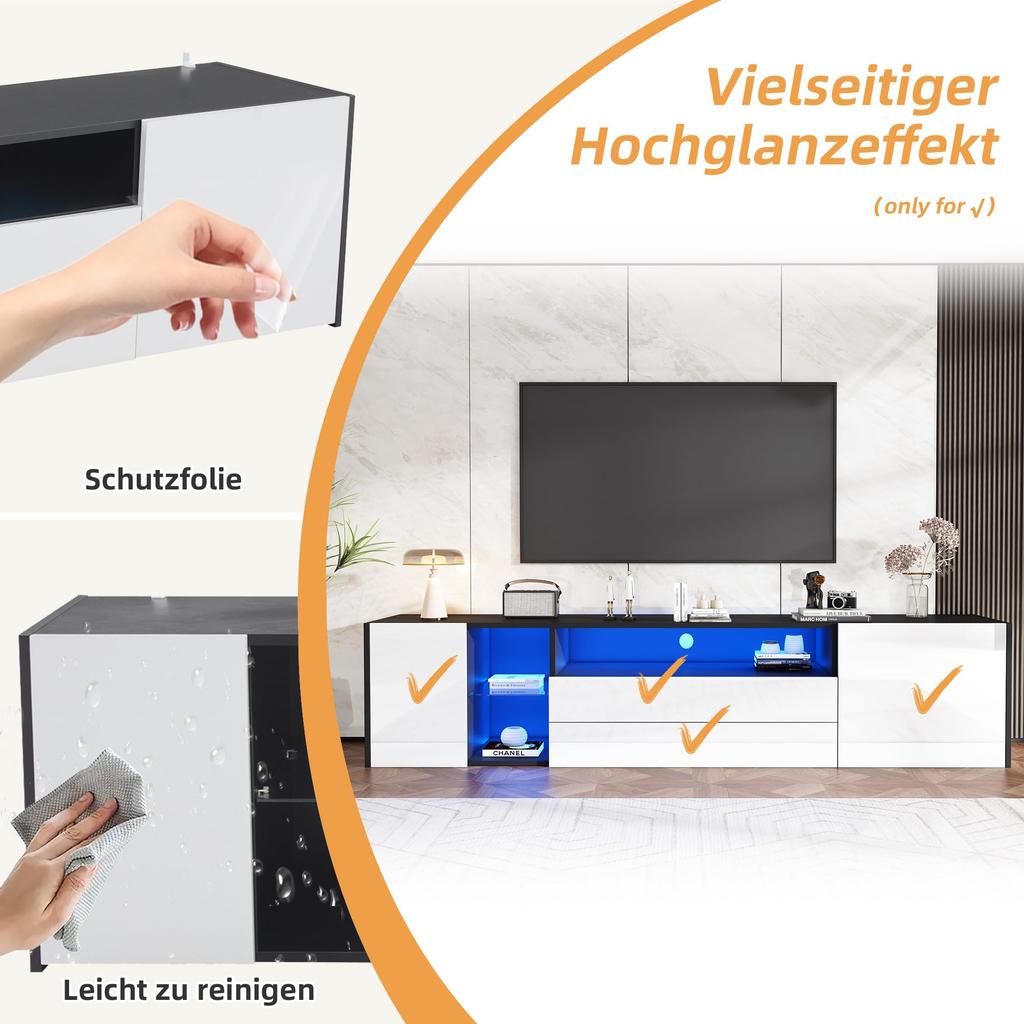 TV-Schrank LED, Hochglanz 2 Türen 2 Schubladen, TV-ständer Fernseher bis zu 75 Zoll, TV Lowboard Wohnzimmer, Esszimmer, 180cm, Schwarz & Weiß