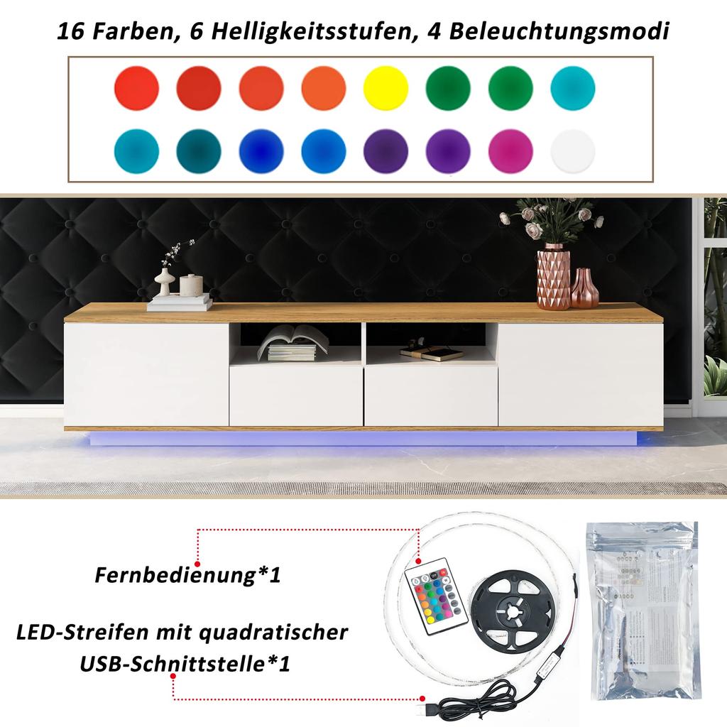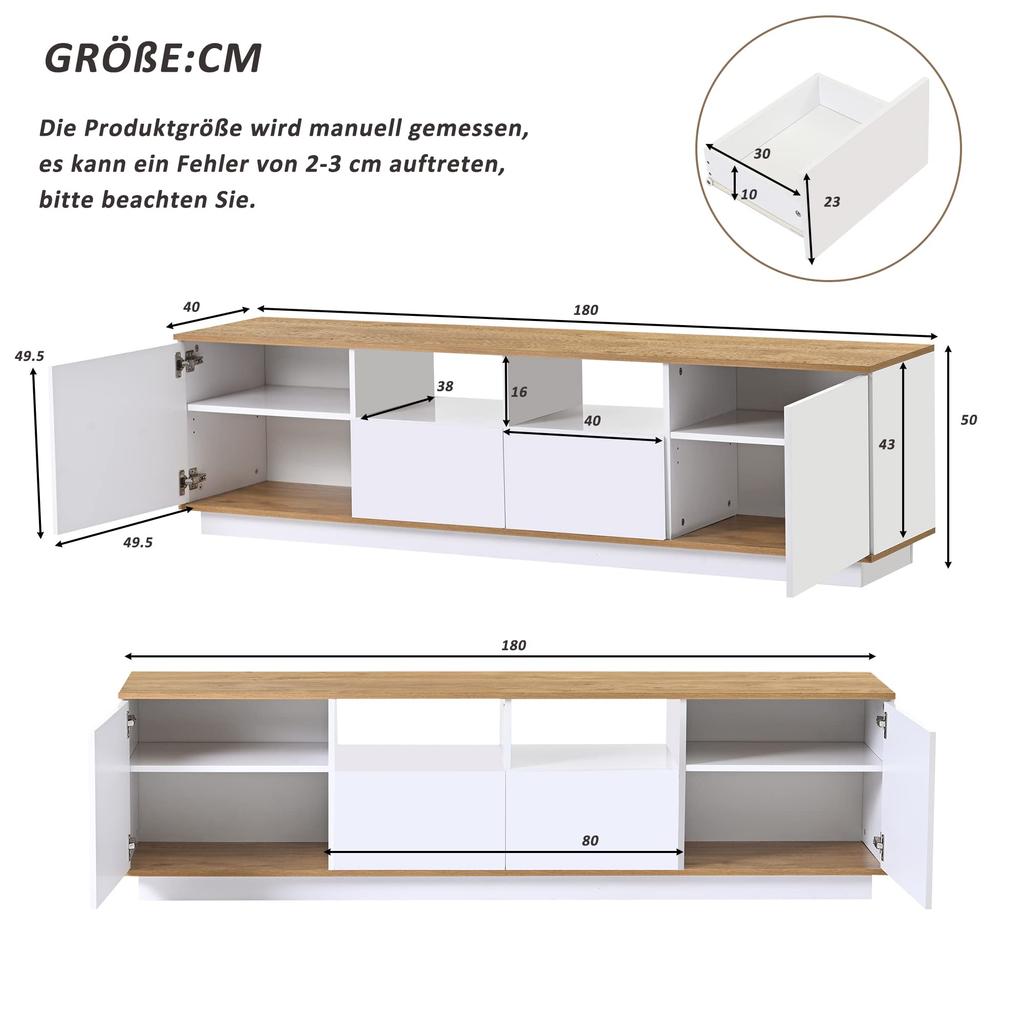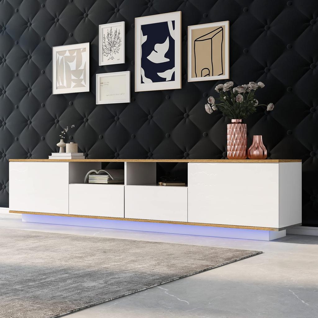 ТВ тумба 180 см шириной, светодиодная подсветка, современный ТВ шкаф, 2 отделения, 4 открытые полки, гостиная, столовая, белый и дуб, 180 x 40 x 50 см
