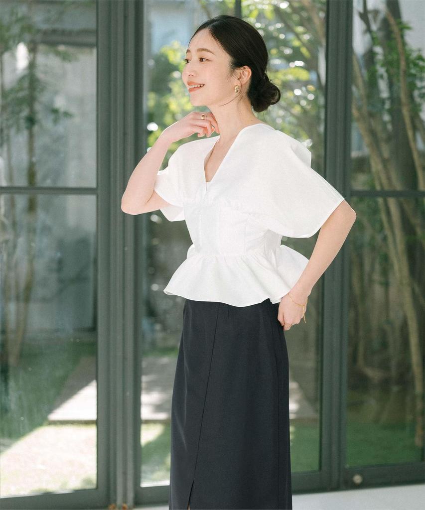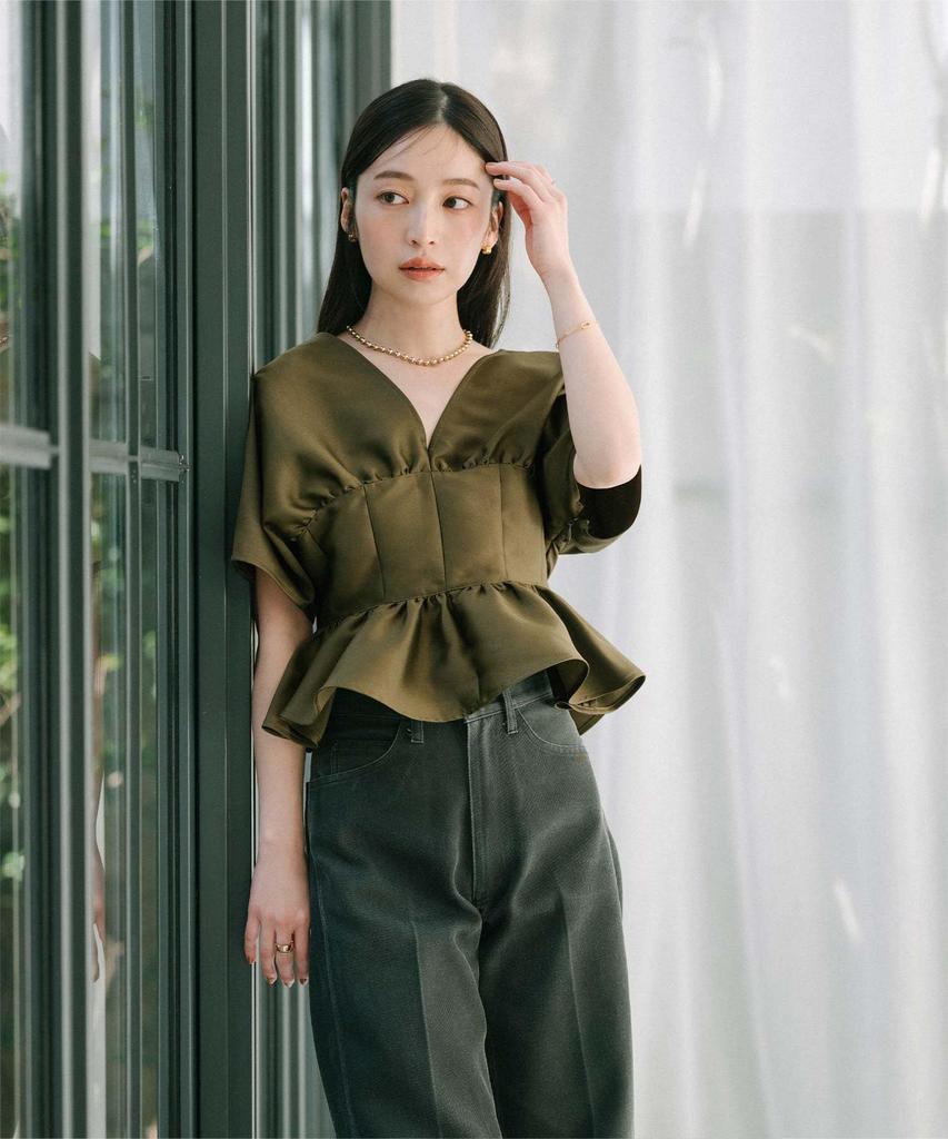 This cropped top features a deep V-neck in the front and back, revealing a feminine and elegant look. Key Features: Deep V-neck design: The deep V-neck in the front and back beautifully accentuates the décolleté line, allowing for a touch of skin. Corset-inspired waist shaping: The corset-inspired waistline creates a flattering effect and a slimming silhouette. Feminine ruffled hem: The ruffled hemline adds a feminine and glamorous touch. Elegant sheen and firmness: The elegant sheen and firmness of the material create a glamorous look, even with simple outfits. *If you are concerned about the feel of the material, we recommend wearing an inner layer underneath. Coordination: Perfect for glamorous occasions: This top is perfect for special occasions like parties and dinners. Casual or dressy: Pair with denim, a skirt, or leather for a casual look, or dress up with simple bottoms for a more dressy look.・The impression changes depending on the bottoms you choose: Because it is cropped, high-waisted pants