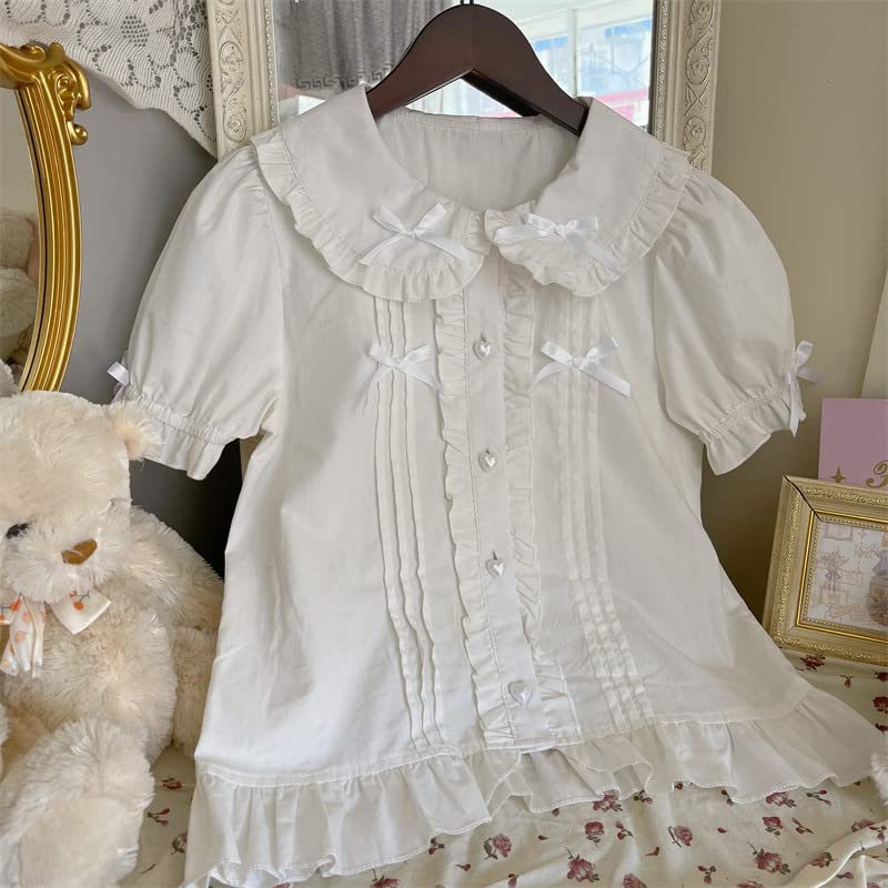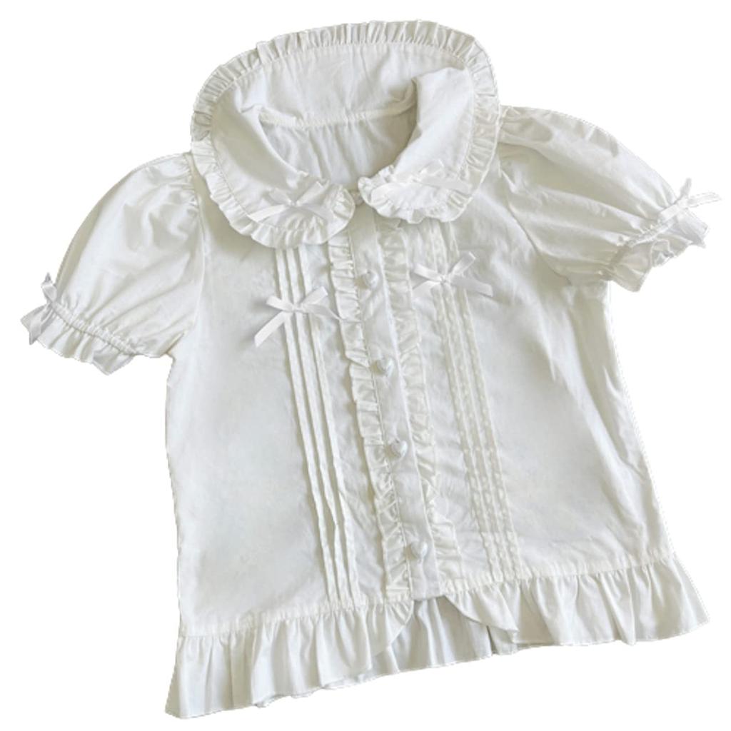 [Особый дизайн] Эта блузка с короткими рукавами и оборками выполнена в аккуратном белом цвете.. Маленькая ленточка и пуговицы в форме сердечек — главные акценты. Рекомендуется для тех, кто хочет наслаждаться одеждой лолиты даже в жаркое время года.. Эта простая, но милая вещь легко сочетается с любой юбкой-сарафаном и является незаменимой!