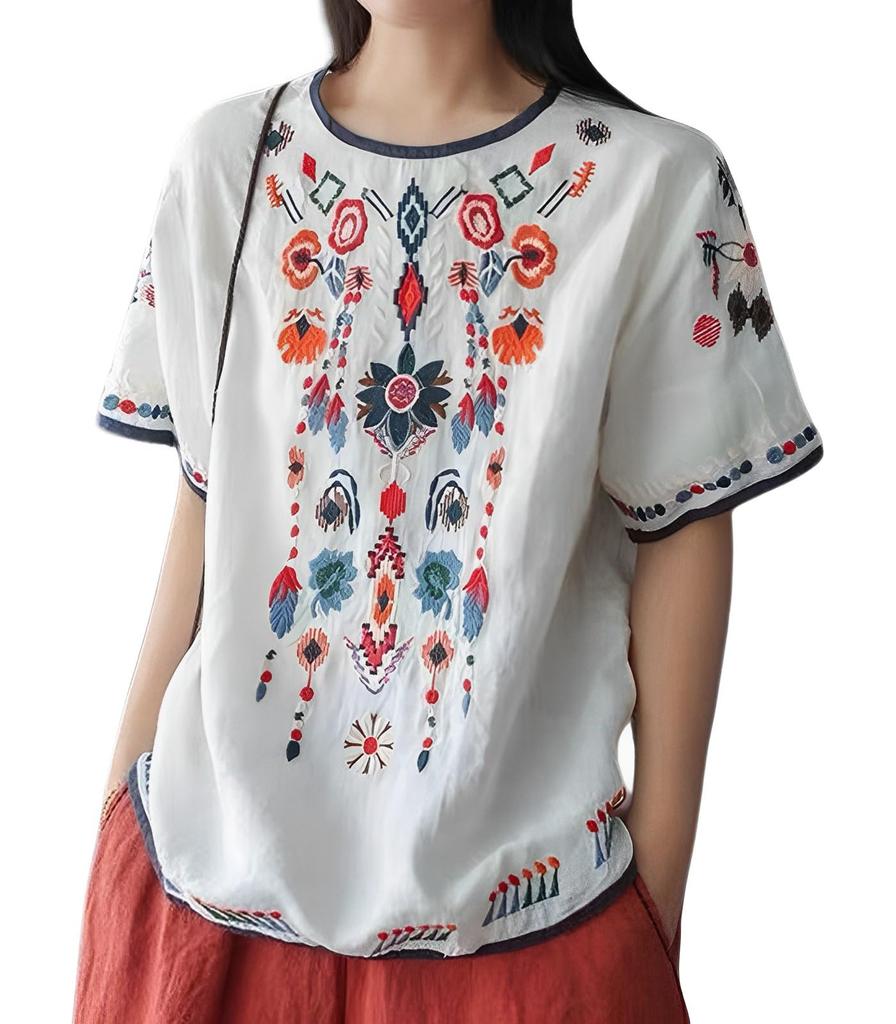 Представляем стильную блузку с вышивкой в азиатском стиле и свободного кроя.. Вышивка на рукавах и спереди не слишком броская, но все же эффектная, придающая богемный шарм просто при ношении.. Его можно носить отдельно или в сочетании с брюками или юбками, что делает его универсальной вещью, которую можно координировать с широким спектром нарядов.