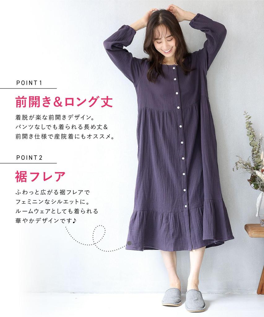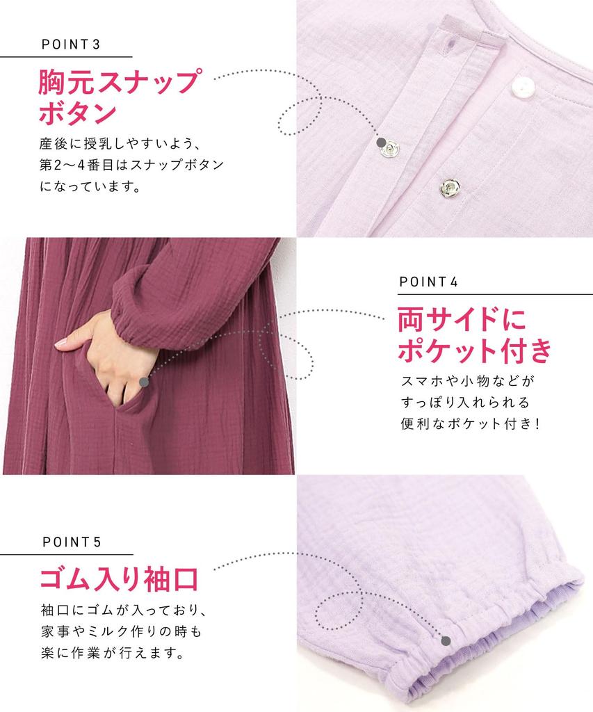 [Застежка спереди и удлиненная длина] Конструкция с застежкой спереди облегчает надевание и снятие. Удлиненная длина и застежка спереди делают его удобным для ношения даже без брюк, что делает его рекомендованным для одежды для беременных.. [Расклешенный подол] Мягко расклешенный подол создает женственный силуэт. Великолепный дизайн делает его подходящим для ношения в качестве домашней одежды♪ [Кнопки-защелки на груди] Вторая-четвертая пуговицы - это кнопки-защелки, чтобы облегчить кормление грудью после родов. [Карманы с обеих сторон] Поставляется с удобными карманами для хранения вашего смартфона или других мелких предметов! [Эластичные манжеты] Манжеты эластичные, что облегчает выполнение работы по дому или приготовление молока. [Двусторонний: перед и спина] Двусторонний дизайн позволяет носить его, просто застегнув пуговицы сзади.