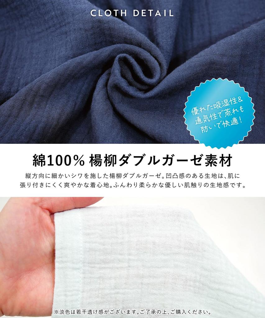 [100% хлопок, ивовый двойной марлевый материал] Ивовый двойной марлевый материал с мелкими вертикальными морщинами. Текстурированная ткань не прилипает к коже и освежает при носке. Ткань мягкая и пушистая на ощупь. Превосходное влагопоглощение и воздухопроницаемость предотвращают духоту и обеспечивают комфорт! *Светлые цвета слегка прозрачны.