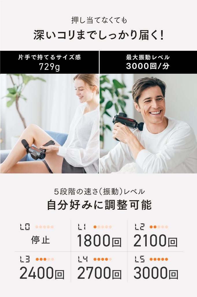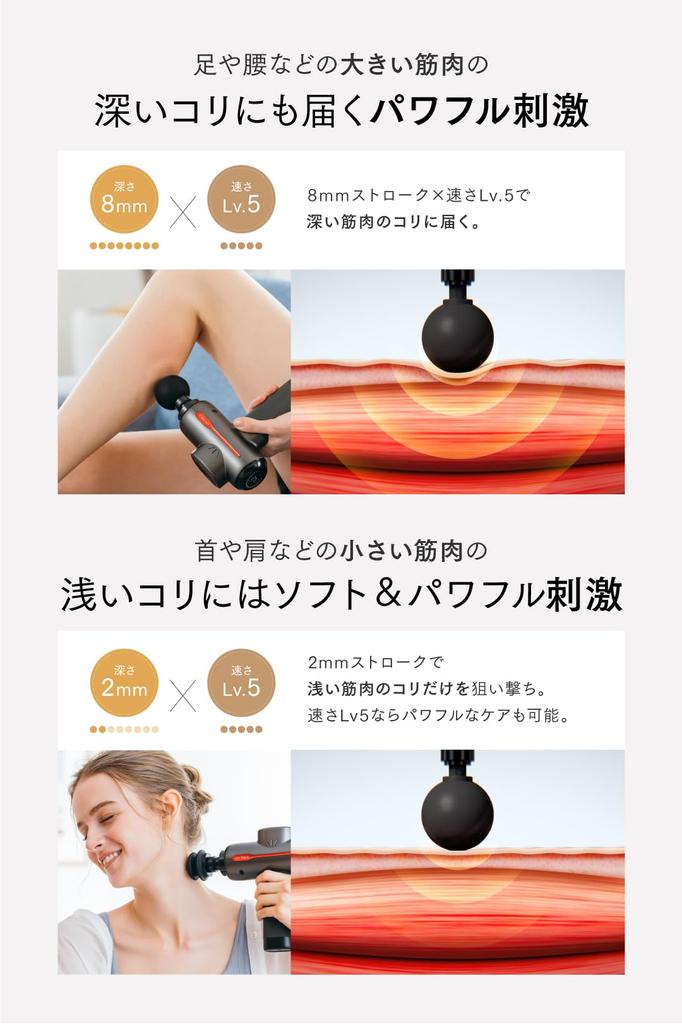 Мощная стимуляция, достигающая глубоких слоев крупных мышц, таких как мышцы ног и бедер. Глубина 8 мм x Скорость Уровень 5. Ход 8 мм достигает глубоких мышц, а 5-й уровень скорости обеспечивает мощную стимуляцию!