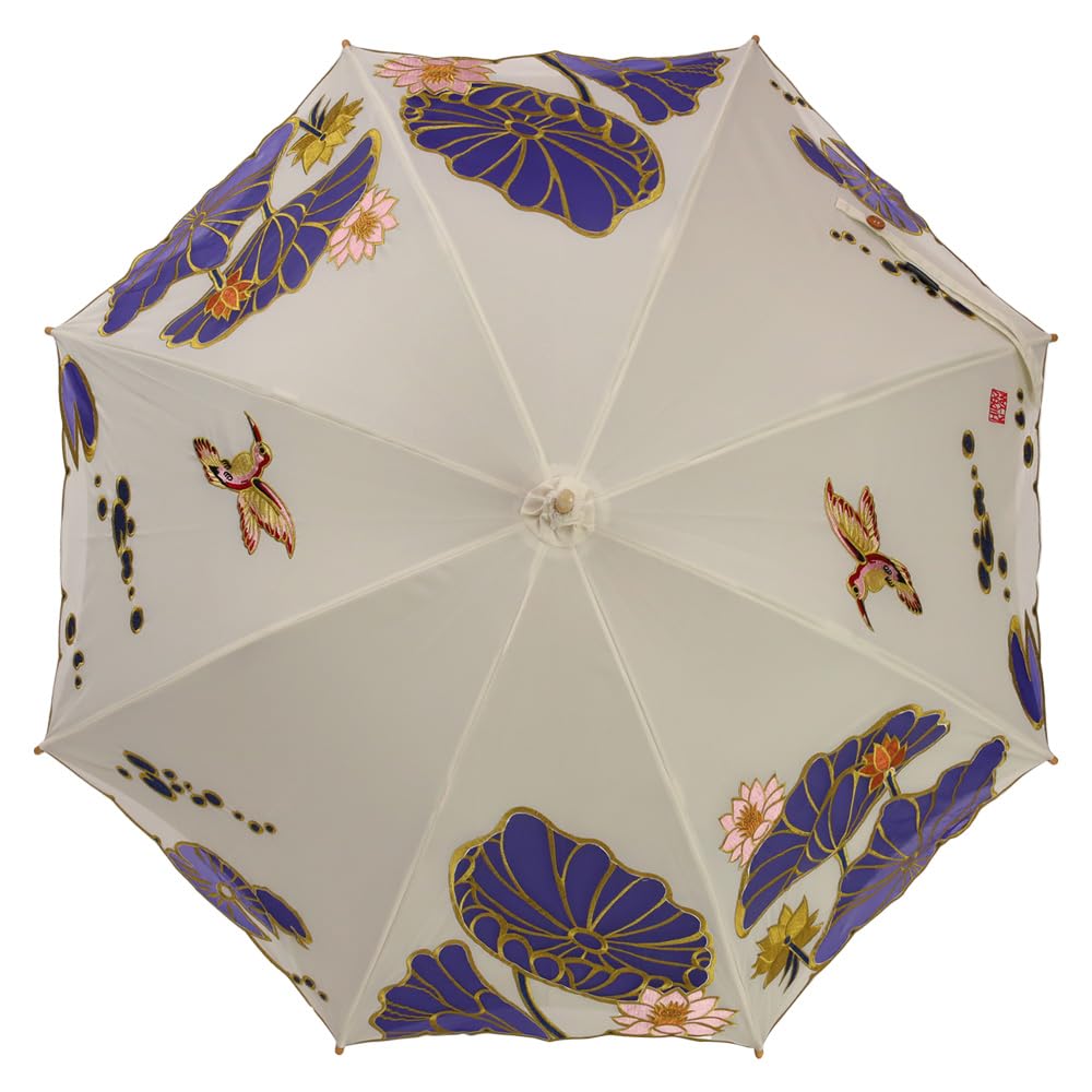 Этот дизайн был создан в сотрудничестве с Кимурой Хидэки (Киян), ведущий киотский художник. Его уникальные и смелые картины, которые можно найти в известных храмах и других местах, принесли ему много поклонников.. Два дизайна Кияна, «Цветок лотоса», его визитная карточка, и «Пион и глициния», первое в истории сочетание, смело вышиты на зонтике с аппликацией из органзы.. Это зонт с сильным присутствием.