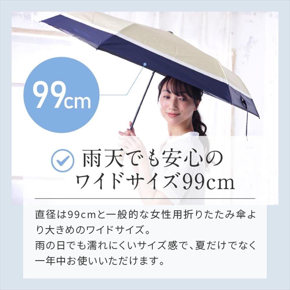 [Круглогодичное использование] Водоотталкивающая ткань отлично отталкивает воду. Внутренняя часть имеет полиуретановое покрытие, поэтому дождевую воду можно легко удалить, не давая ей впитаться.. Диаметр зонта составляет 99 см, что делает его шире, чем типичный женский складной зонт.. Его размер сохраняет вас сухим даже в дождливые дни, что делает его подходящим для использования круглый год, а не только летом.