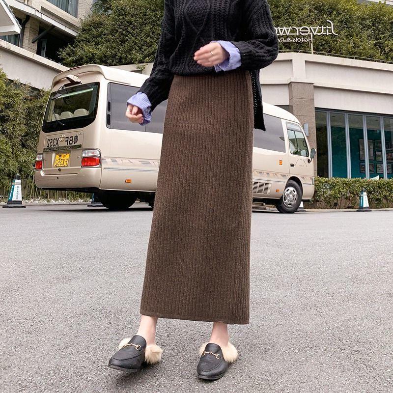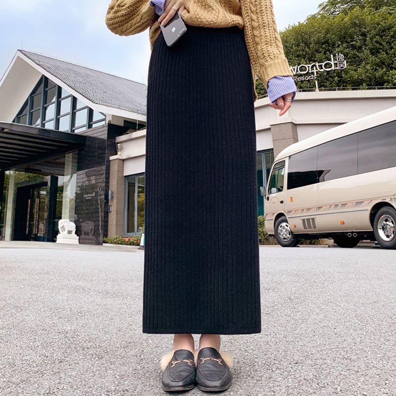 Облегающая Трендовая Женская Толстая Вязаная Длинная Миди-Юбка с Завышенной Талией без Разреза Черная Шерстяная Юбка